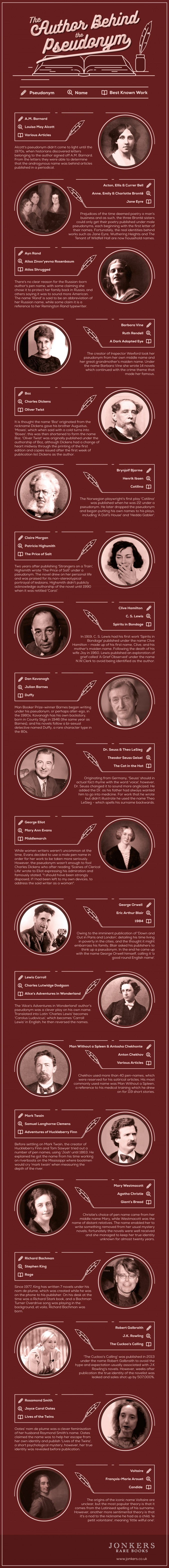 Our new infographic explores pseudonyms used by famous authors, as well as the reasons behind the choice of their nom de plume and works they published under it. For example, do you know which writer had works published under the name Man Without a Spleen? Or, are you one of the few who still think George Eliot was a man? To find out the true identities of these authors and others take a look at our infographic below.