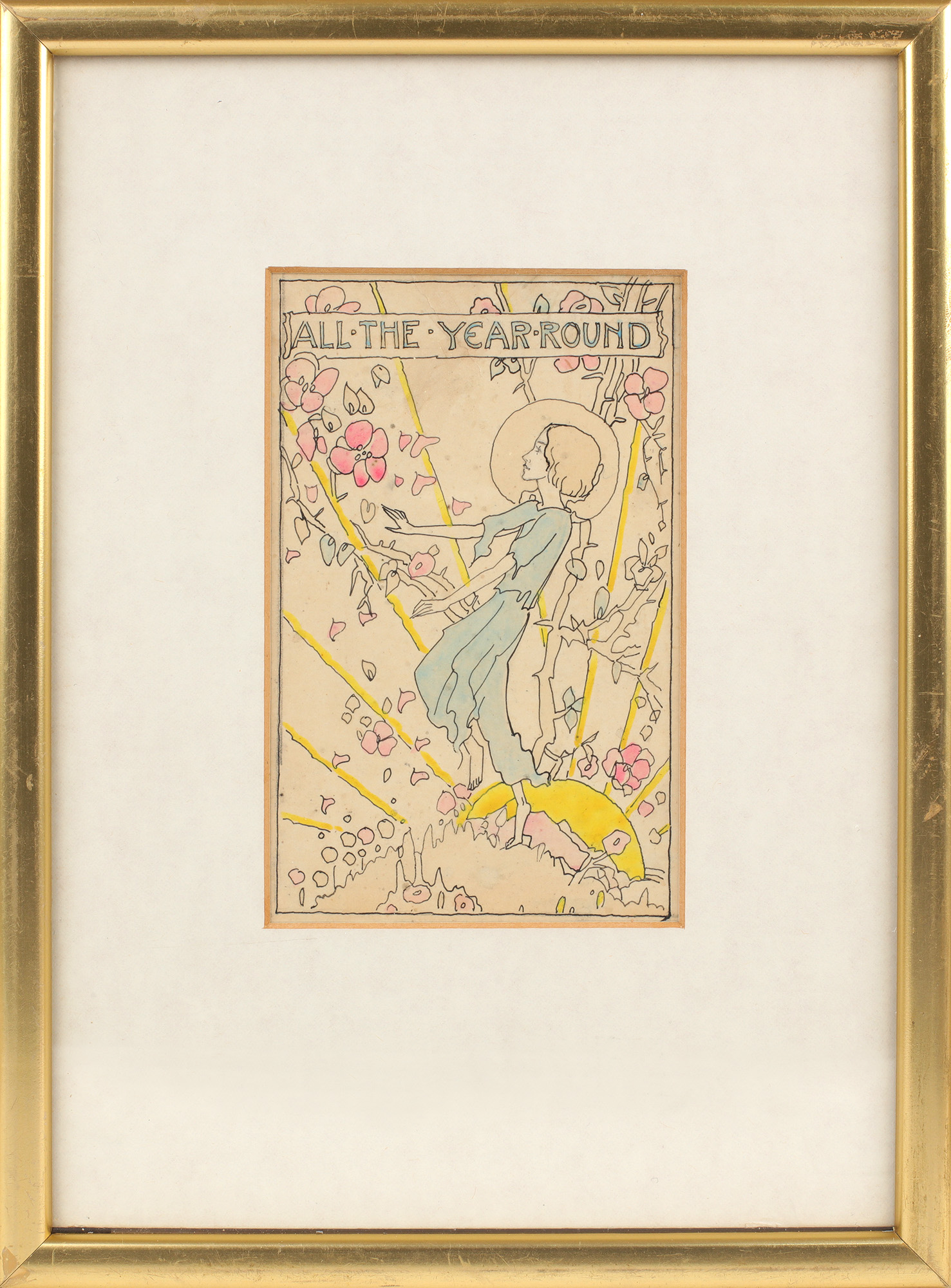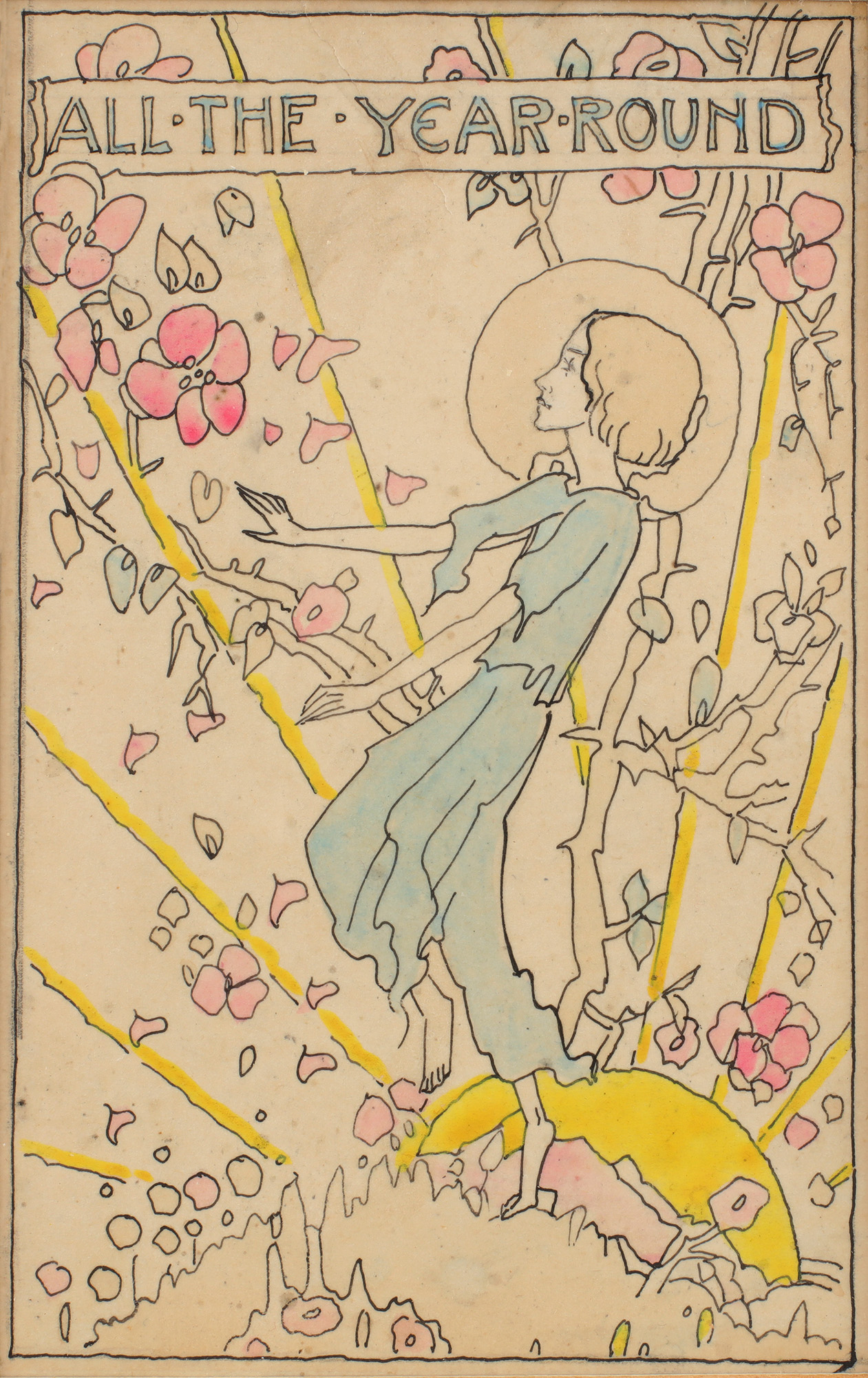 An original ink and watercolour design for Eleanor Farjeon's All the Year Round. 13.5cm x 8.5cm. Ink and pastel shades of water-colour. A haloed central figure surrounded by flowers. In very good condition, with some light fading to the colours. A striking piece.