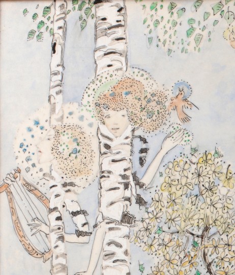 A large original watercolour on japon. 33cm x 41cm. Signed to the lower right hand corner, with the legend "Youthe" in Jessie's distinctive lettering. A vibrant fantasy scene, where children dance with sprites accompanied by dryads playing lyres. A woodland setting with an abundance of flowers, rabbits and birds. In the distance stand the hills of Arran. In very good condition indeed.