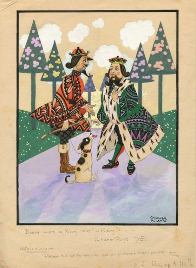 A fabulous Art Deco inspired original ink and watercolour illustration on paper for the nursery rhyme There was a King Met a King. Approx. 22cm x 17m. Signed in the lower right hand corner. A very good quality, bright image. Annotated in pencil by the artist, with title and note to the engraver.