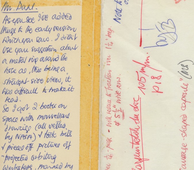 Nevertheless, she was chosen and the annotations and correspondence on the pictures suggest a generous, open and collaborative working relationship between the author and the illustrator. A note by Jacques under her depiction of the chocolate room reads “Sorry I’ve had to cross the gutter. I tried to avoid it in first version of this but it doesn’t do, it divides too much for the meaning. I know we’ll lose a bit in the middle but I think it’s a case where we’ll have to let the chips fall where they may…”. Elsewhere she addresses a long note to “Mr Dahl” on the technical aspects of her depiction of the space hotel that concludes “I know it's fantasy but all the same I do like to have a bit of factual basis - and thousands of little boys know so much these days!”.