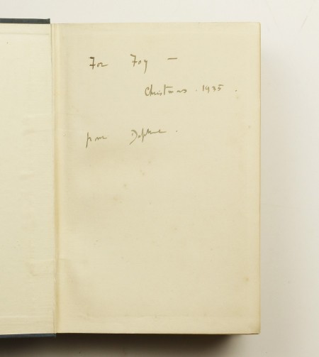 The relationship between Foy and Daphne was obviously a close one and the two women maintained a long and loving correspondence, in which Daphne was able to air her concerns. “You are the greatest comfort to me always” and “if I was with you we'd be cutting wood and not talking at all.” They both enjoyed the often wild and stormy landscape of Cornwall, and would go horse riding over the moors, once famously staying at a lonely and atmospheric inn on a dark and wintery night, where the plot for Jamaica Inn began brewing. Thus this inscribed copy of the novel which Daphne sent to Foy as an early Christmas present in 1935 has particular resonance.