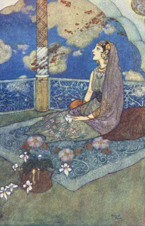 As time went on Dulac’s fascination with the art of the Orient began to influence his work. His uncle was an antique dealer handling Oriental art and artifacts and from an early age Dulac had been entranced by the exoticism of Oriental design. Such was his attention to detail that he threw himself into his research of the subject taking an interest not only in the art and culture of the region, but he also learning to speak both Arabic and Chinese.