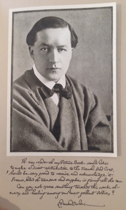 The outbreak of the First World War heralded an end to the era of opulent gift books. During this time The Daily Telegraph joined forces with Hodder and Stoughton to raise funds in support of the French Red Cross and who could be more appropriate to illustrate the volume of fairy tales than French artist Edmund Dulac. He chose some of his most popular illustrations form earlier books and added three brand new ones. Priced at just 3 shillings the book proved hugely popular, within the book reproduced below a photograph of the artist is his handwritten plea: " If any reader of my picture book would like to make a direct contribution to the French Red Cross, I should be very proud to receive it and acknowledge it. France bled of treasure and supplies is giving all she can. Can you not spare something towards this work of mercy and healing among our most gallant Allies?"