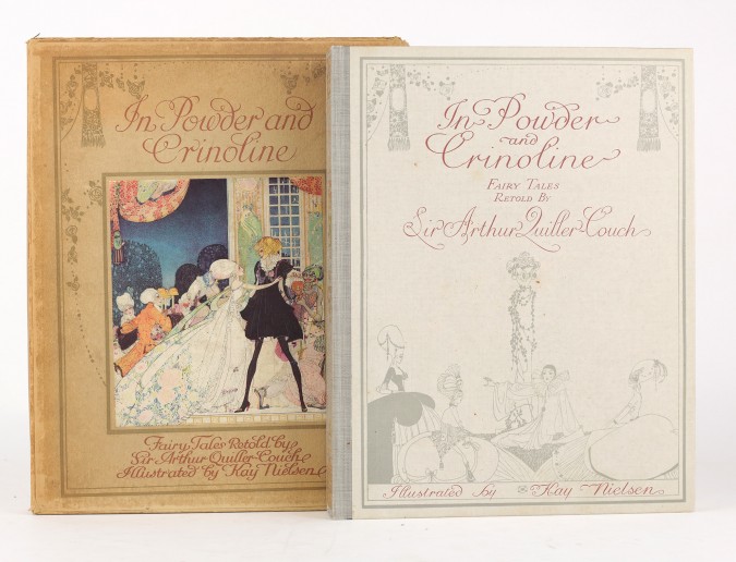 Nielsen illustrated four major gift books, the first of which In Powder and Crinoline was published in time for the Christmas gift market of 1913. It was issued in two formats; a sumptuous Edition de Luxe, bound in green vellum with gilt embossed decoration and signed by Nielsen.
