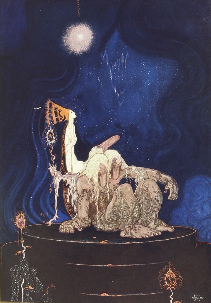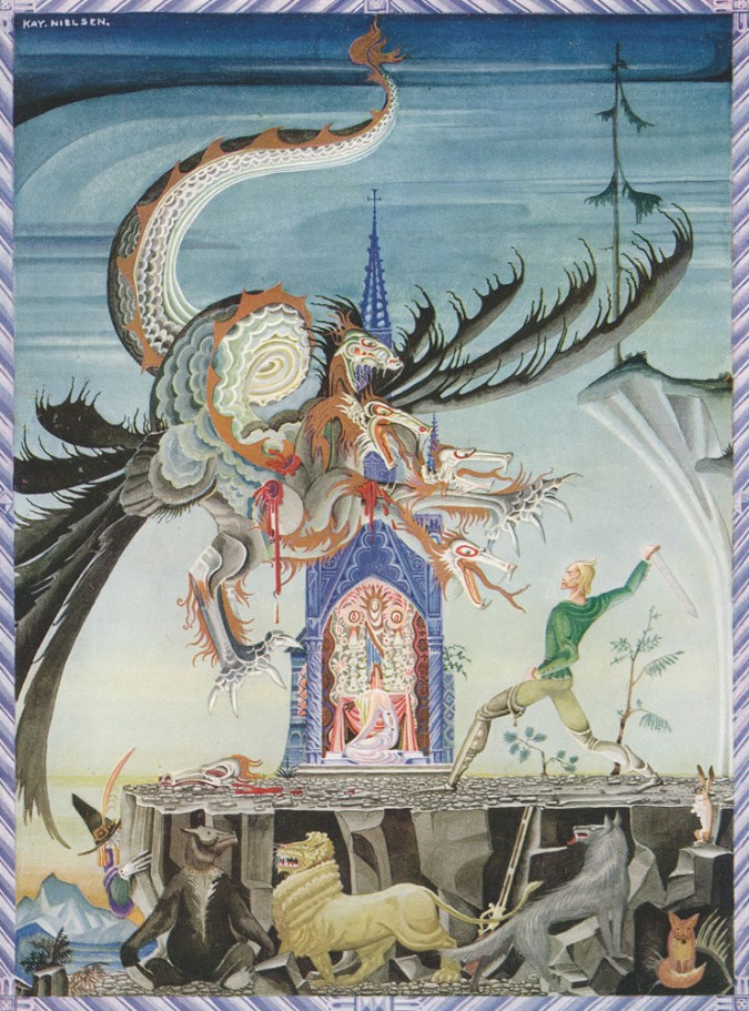 Keith Nicholson says of the illustrations “These 25 illustrations represent Nielsen at his most spectacular. An advance of strength and decorative feeling on his former illustrations is marked.” Whilst Nielsen’s images still highlight the influence of Art Nouveau his skill and imagination are strong enough to give all his drawings an individual and unique charm.