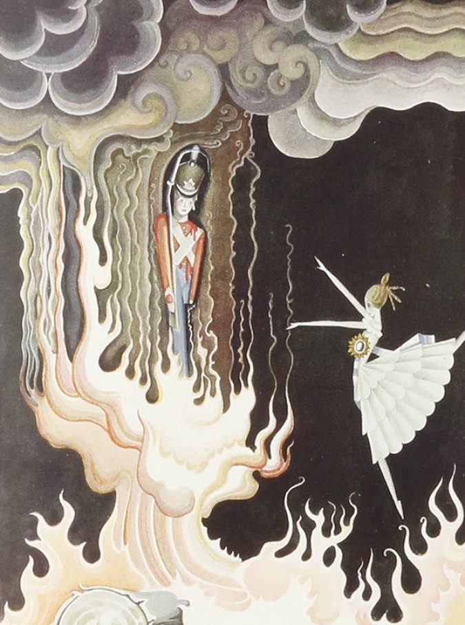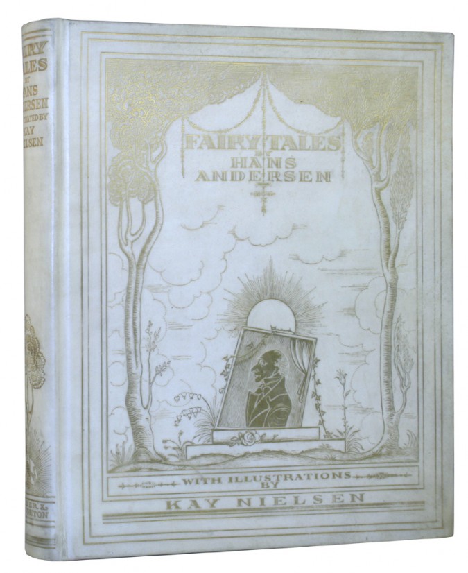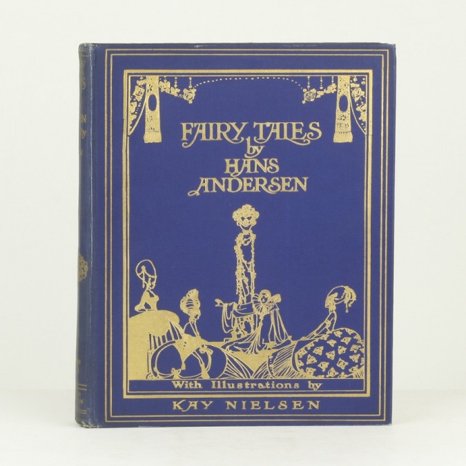 Due to be published next was a collection of Hans Andersen's fairy tales, but the advent of war put on hold luxury book production and hence it was almost a decade before Nielsen's Hans Andersen was published, at Christmas 1924. The deluxe edition comprises 500 copies and was issued in two bindings, a white vellum and a navy cloth, each version signed by Nielsen and each with a different cover design.