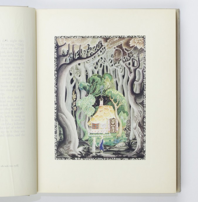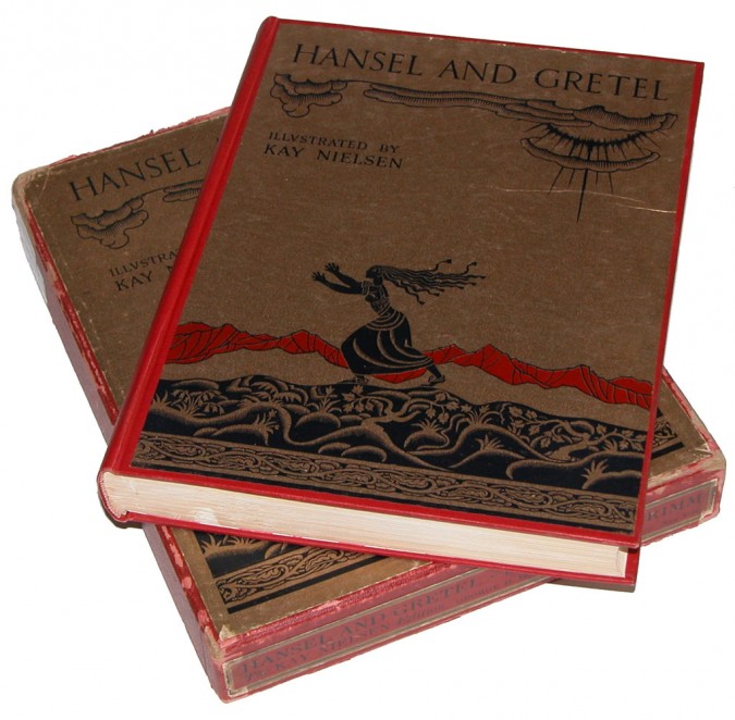 It came as no surprise that the fourth major gift book to be illustrated by Nielsen would be the fairy stories of the Brothers Grimm. Entitled Hansel and Gretel and other Stories of the Brothers Grimm, the book sees a chance in style reflecting fashion of the times, as Art Nouveau begins to give way to the influence of Art Deco. Once again Hodder produced a large deluxe edition of the book, limited to just 600 copies and signed by Nielsen. Part way through production someone spotted that Nielsen's name had been spelt incorrectly. Some initial copies had already been distributed with the spelling "Nielson" to the spine, others which had already been bound were corrected with a strip of blue cloth acting as name label.
