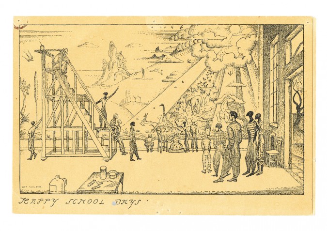 In 1944 Nielsen was commissioned by the Filippa Pollia Foundation to paint a mural which would be enjoyed by the children of Los Angeles. The mural originally hung in the Downtown Central Junior High School, which subsequently closed and in 1949 the painting was rehoused in the library of Sutter Middle School. The mural is vast, 20 foot tall and 30 foot wide and depicts the newly created world as suggested in the bible, featuring more than 200 species of animals. Upon relocation to Sutter Nielsen was dismayed to find that the painting, which consisted of five canvas panels had been badly stored and damaged. He erected a scaffold in Sutter's library and carefully restored the painting. His wife Ulla aided his work, offering both moral and practical assistance, she was allowed to help repaint the grass and the background, but not the animals! During the creation of the mural Nielsen drew inspiration from the book of Genesis and also from Haydn's creation, a piece of music which had moved him enormously as a child. The drawing above is taken from a presonal card Nielsen made to commemorate the work on the mural.