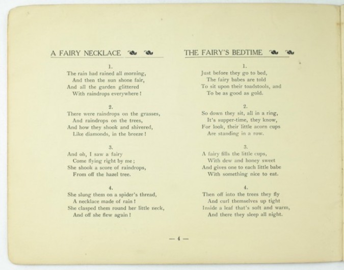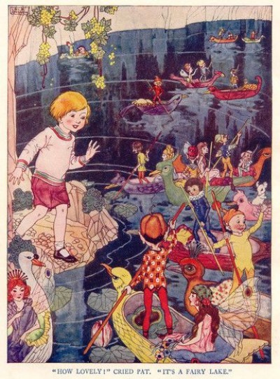 Thus her first two books, Child Whispers, published in 1922 and Real Fairies, 1923, were little volumes of verses in a whimsical style, similar to those that would follow a year later in A.A. Milne’s When We Were Very Young. The books had a pictorial covers drawn by Blyton’s old school friend, Phyllis Chase.