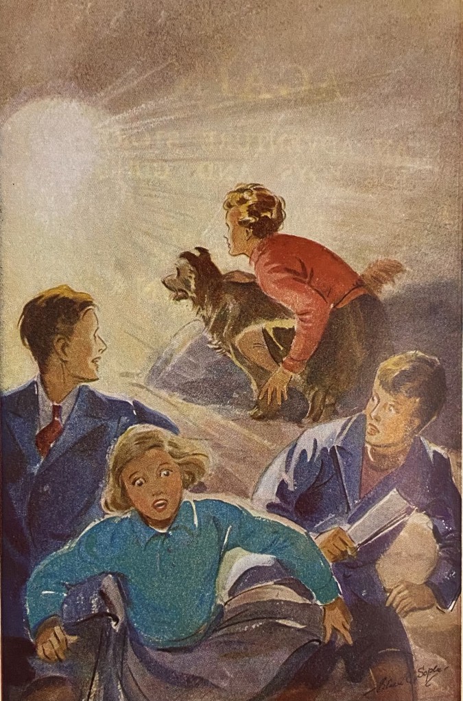Further adventures in this series, used different artists. New Zealander, Harry Rountree, whose drawings added a burst of colour to books 2 and 3, The Secret of Spiggy Holes and The Secret Mountain. The fourth in the series, The Secret of Killimooin, had drawings by Eileen Soper and finally in 1953 The Secret of Moon Castle, with a slightly ‘cutesy’ cover design by Dorothy Hall.
