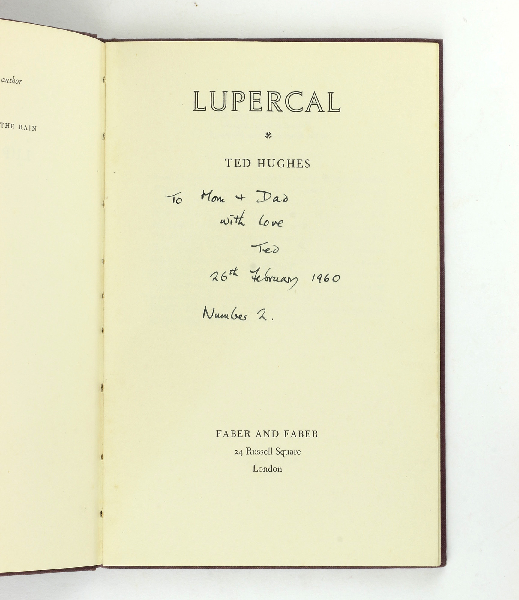 Hughes received six author's copies on 23rd February from Faber (some three weeks before the official publication date). He inscribed the first copy to his wife Sylvia Plath, and this, as denoted by his inscription, is the second copy he inscribed.