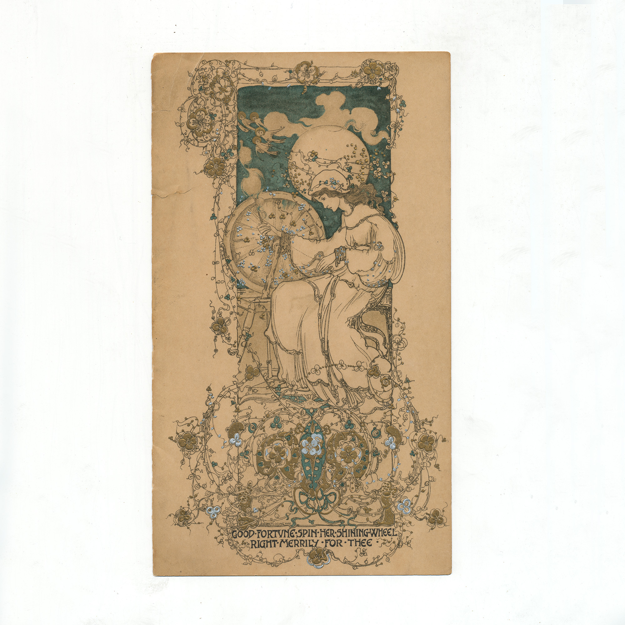 An exquisite Christmas card, designed by Jessie M. King for her personal use. The card comprises two sections: the outer card bears a delicate and intricate drawing of a maiden at a spinning wheel surrounded by garlands of flowers, printed in blue and black it is highlighted with gold and silver; a folded inner card is inscribed in Jessie's hand, "with love and the best of luck from your loving Jake." A printed legend on the upper cover reads, "Good fortune spin her shining wheel right merrily for thee." 22 x 12.5cm. The card is in very good condition, the drawing is bright and clean, though there is a short closed tear to the fold and joint between front and rear joint strengthened.