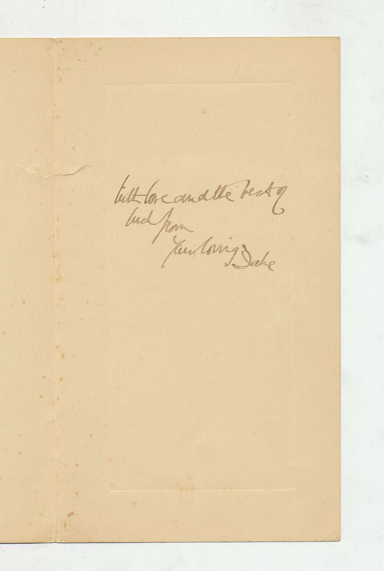 Jake was the playful nickname that E.A.Taylor gave to Jessie shortly after they met in 1898 and which their group of friends fondly called her. Each year Jessie would design and print a number of cards to be used by her and her husband, E.A.Taylor. Agnes Harvey was part of Jessie's circle of artist friends during her years at the Glasgow School of Art. Harvey studied silver-smithing in London before returning to teach at GSA and eventually joining the artist's colony in Kircubright. The two women remained friends throughout their adult life, with Jessie sending Agnes inscribed copies of most of her major books. Agnes was known particularly for her decorative metalware and beaten copper work.
