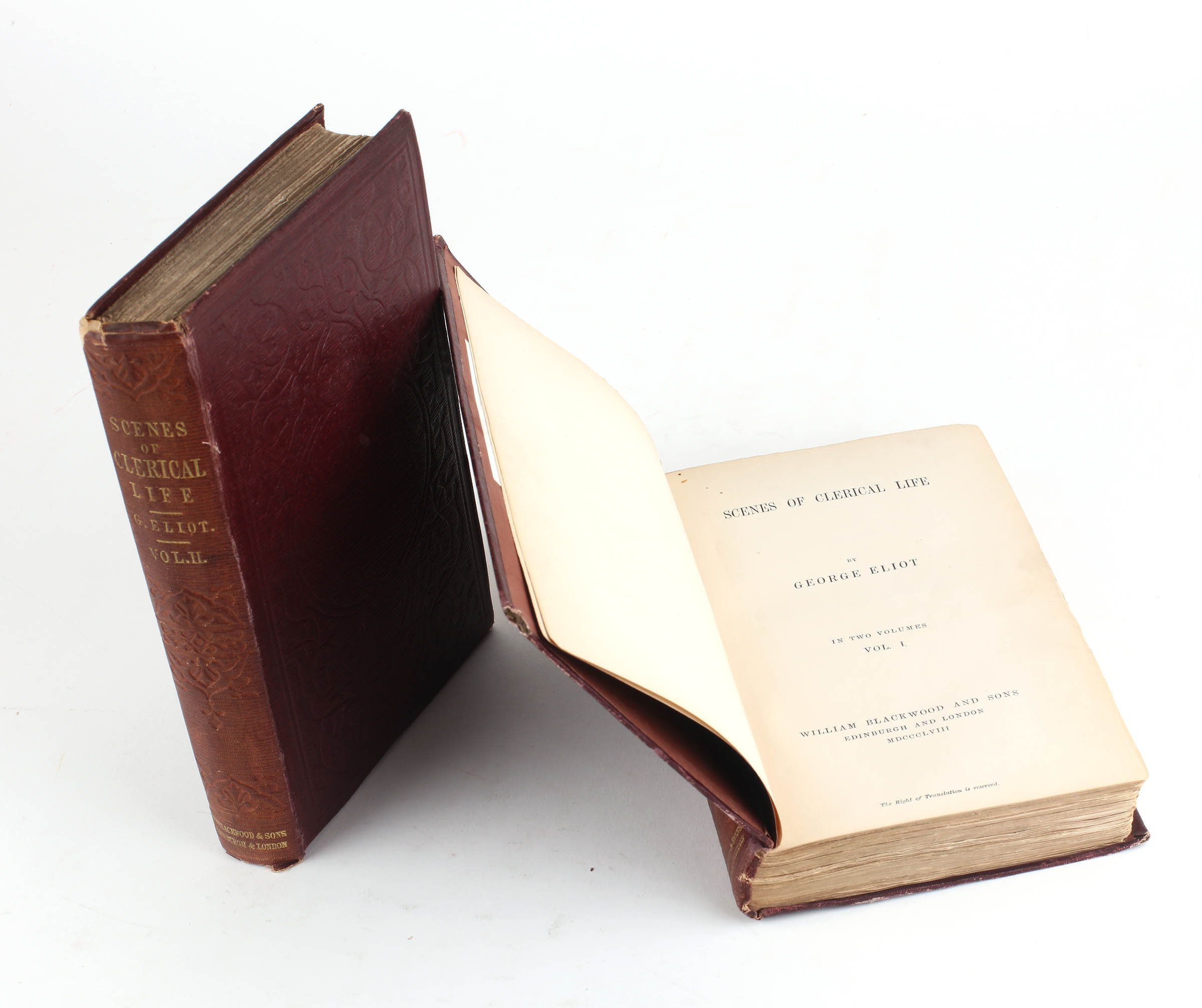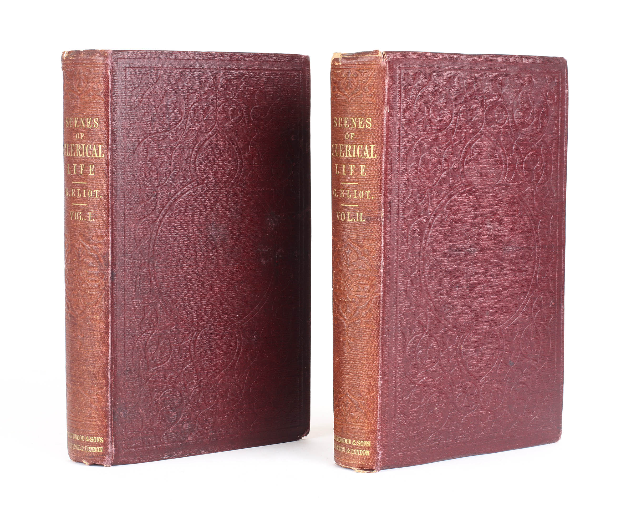 The author's first book, collecting her first works of fiction. At 38 George Eliot was a latecomer to the world of fiction and was particularly self-conscious about publishing creative and original writing. It took considerable encouragement from her partner, G. H. Lewes, to get her stories written and published. It was he who arranged for John Blackwood to publish her first tentative efforts at literary work, Scenes of Clerical Life, claiming it to be the work of a 'friend' called George Eliot. The three stories first appeared in Blackwood's Edinburgh Magazine throughout 1857 and were published in book form in January 1858. The popularity of the book caused much speculation as to the author's identity. The work prompted no less a literary figure than Charles Dickens to write to Blackwood regarding the book,