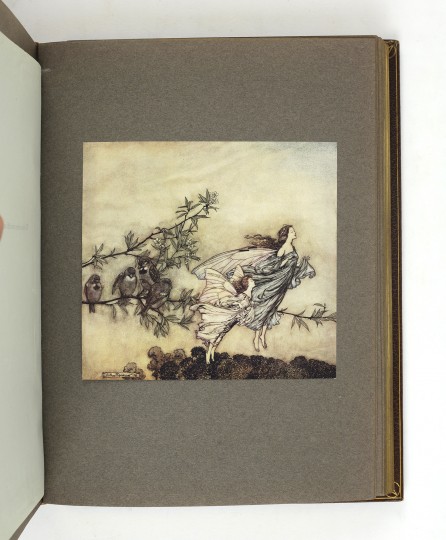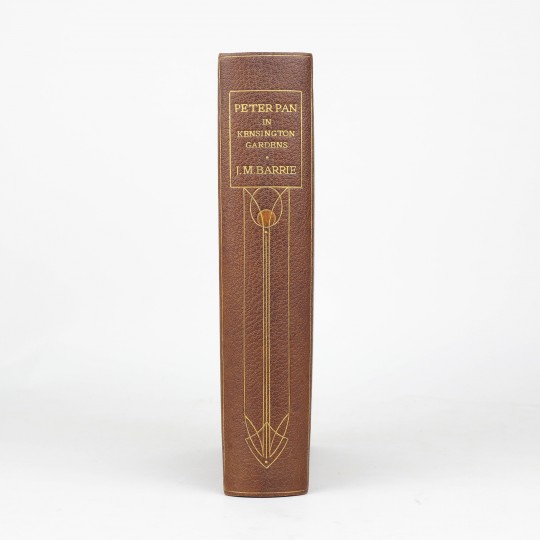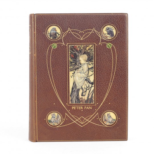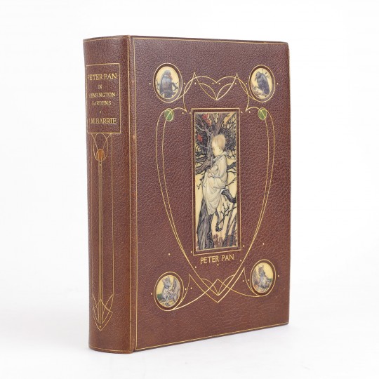 First edition. 4to. Finely bound by Cedric Chivers, c.1906, stamp signed to rear turn in. Full brown morocco, with five inlaid vellucent panels, containing miniature watercolours reproducing Rackham's imagery painted on vellum. A central vellucent panel depicts Peter Pan sitting in a branch, taken from illustration number 19, "Preposterus cried Soloman in a rage". Four further vellucent medallions to the corners depict hand painted animal characters from the story. The upper cover is further decorated with an Art Nouveau design in gilt and two circular green morocco onlays, accentuated by gilt punched dots. The smooth spine is decorated with Art Nouveau gilt decoration and circular amber morocco onlay. Single line gilt border on covers and a heart-shaped gilt design to the rear. Gilt ruled turn-ins and patterned endpapers. All edges gilt. Printed map of Kensington Gardens, plus colour frontis and 49 colour plates by Arthur Rackham. Each plate is mounted onto brown art paper and protected by a captioned tissue guard. Apart from the frontis all plates are grouped together after the text. A fine example of one of Cedric Chivers' magnificent beautiful bindings and as luxurious a copy of Peter Pan as one could hope to encounter.
