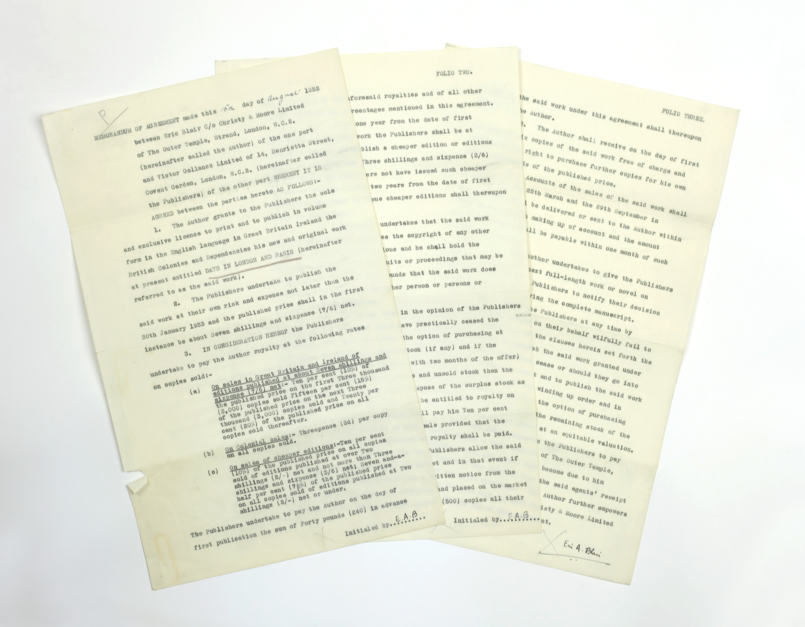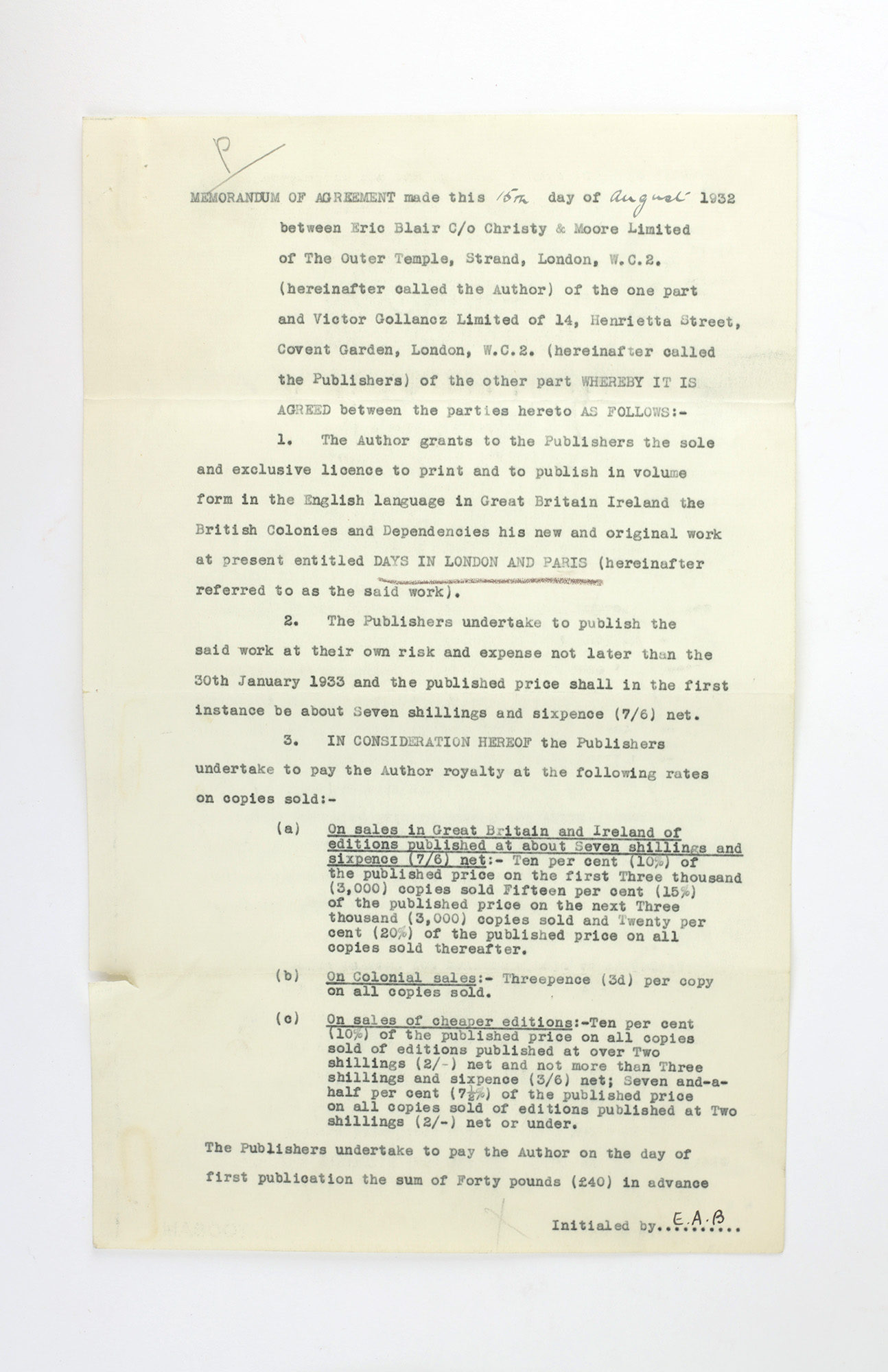 A comprehensive archive of correspondence between Eric Blair, his publisher Victor Gollancz, his agent Leonard Moore and Gollancz's lawyer Harold Rubenstein relating to the publication of Orwell's first book Down And Out In Paris And London.