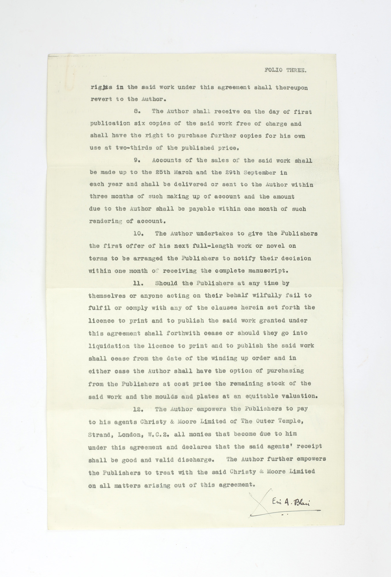 32 items, comprising seventeen TLS, the original publishing contract, two reader's reports and twelve carbons. Including: initial approach letter from Orwell's agent Leonard Moore introducing the author and his "unusual manuscript approximating in its nature to that of a bestseller"; two readers' reports, one highly complimentary and "absolutely convinced by its genuineness" but warning of libel, the other less enthusiastic; letters between Gollancz and his lawyer and between Moore and Gollancz concerning libel and changes made to the text by the author, with Gollancz noting "This is an extraordinary and important book. It is also full of possibilities for libel"; letter from Moore to Gollancz negotiating improved terms; the original contract signed by Orwell for publication of the book under the title "Days in London and Paris"; correspondence regarding the Orwell pseudonym, including a request for information on that subject from The Times; an intemperate exchange of letters and legal threats between Gollancz and a correspondent who claimed the book insulted Jews; correspondence concerning Gollancz's rescinding rights to the book in Dec 1938; later correspondence between Sonia Orwell and Gollancz concerning the Penguin edition, 1965; correspondence between Penguin and Gollancz in 1972, in which the latter admits they no longer possess the original manuscript or proofs.