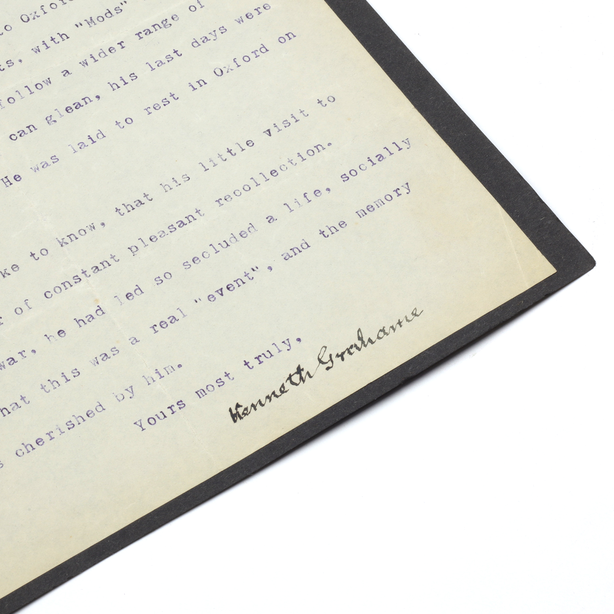A single page of letter paper, headed "Boham's", dated 26 May 1920, thanking Curtis Brown for his "kind words of sympathy with us in our overwhelming sorrow" following the death of Grahame's son, Alastair. He touches upon Alastair's last days,"The dear boy went back to Oxford this term so full of new plans and interests, with "Mods" safely behind him, and liberty to follow a wider range of thought and reading. From all one can glean, his last days were specially happy ones. He was laid to rest in Oxford on his 20th birthday."He also mentions Alastair's enjoyment of a Curtis Brown party he attended,"You may like to know, that his little visit to you was a matter of constant pleasant recollection. Owing to the war, he had led so secluded a life, socially speaking that this was a real "event", and the memory of it was cherished by him." Tipped onto black paper at the upper corners and light creases from the original folding, excellent condition.