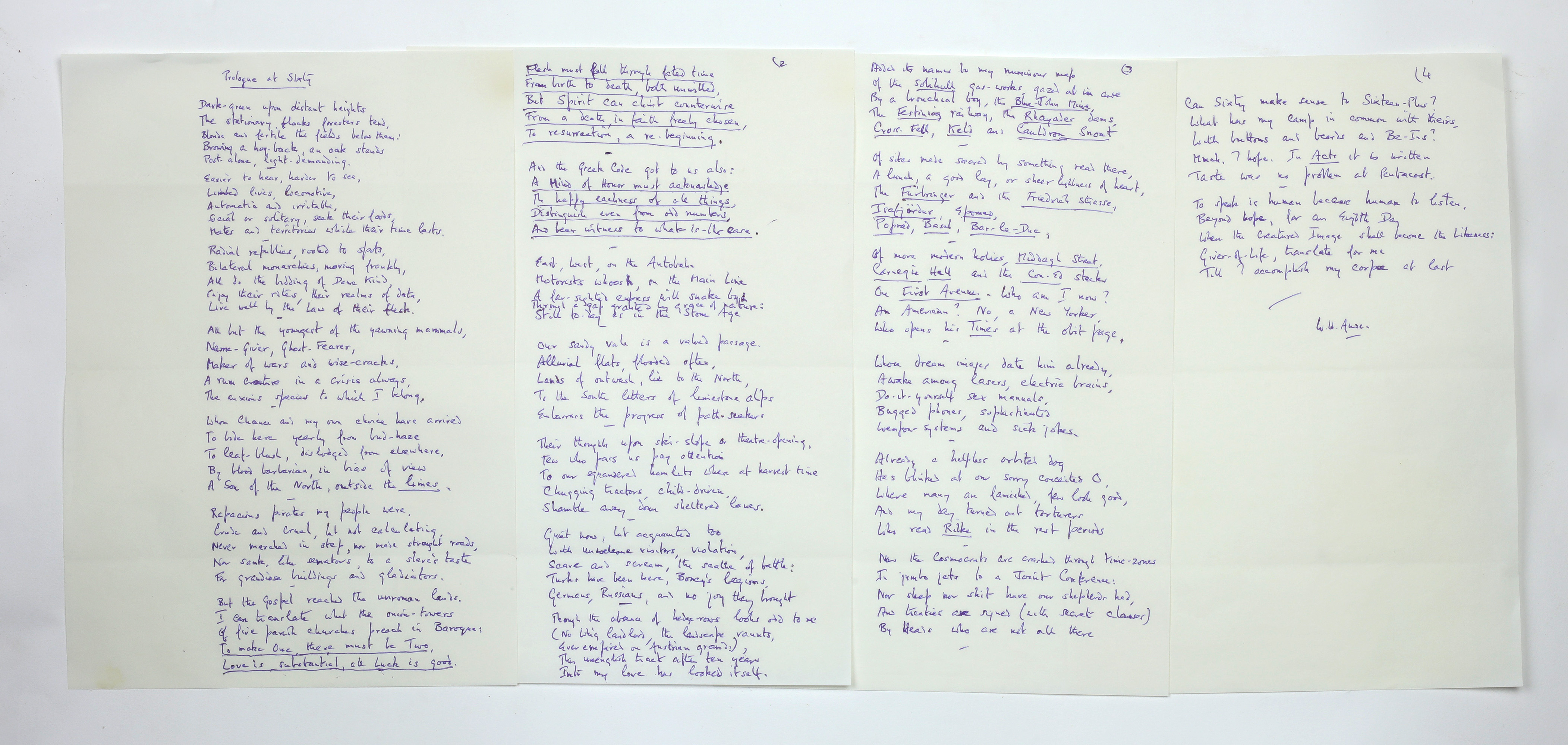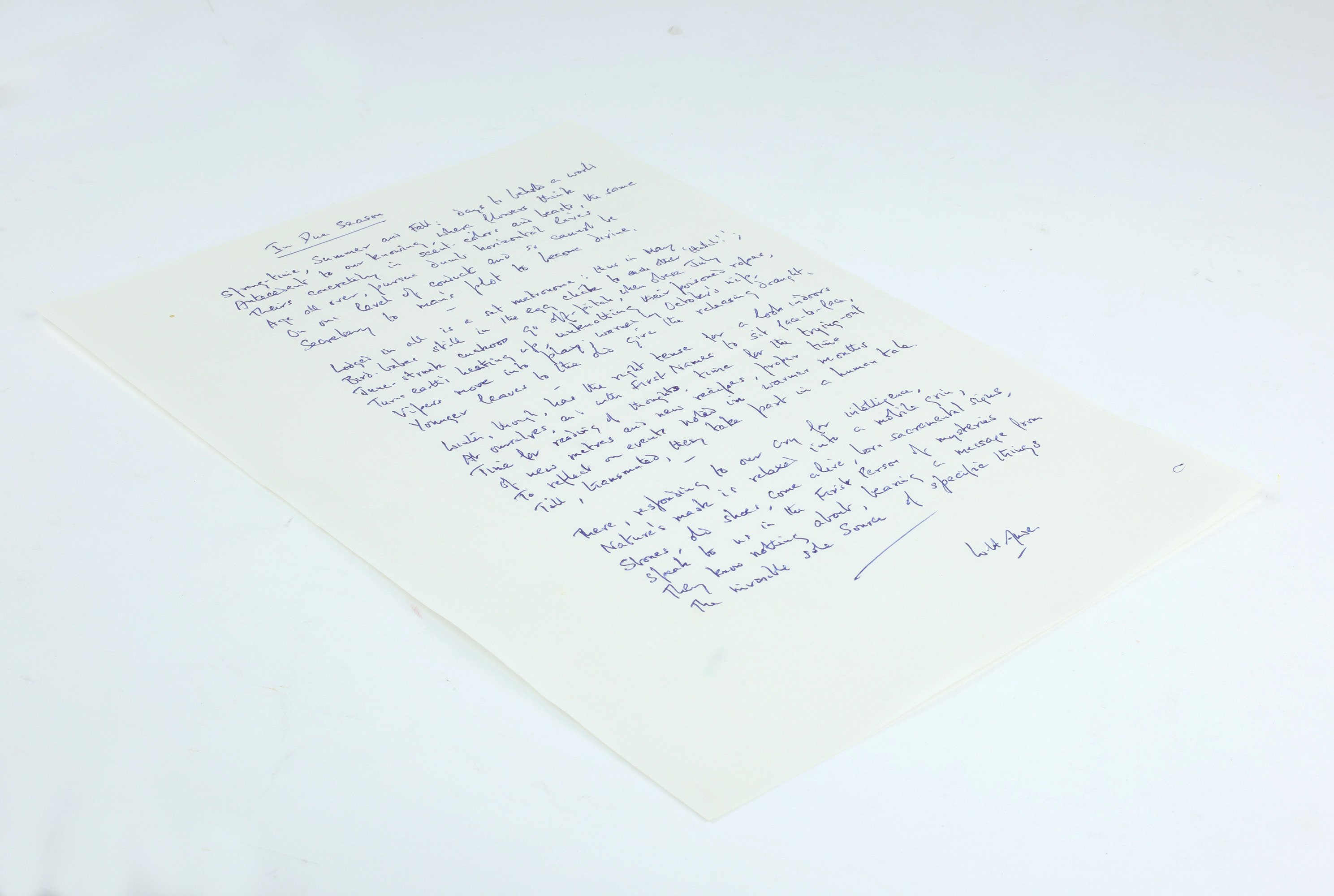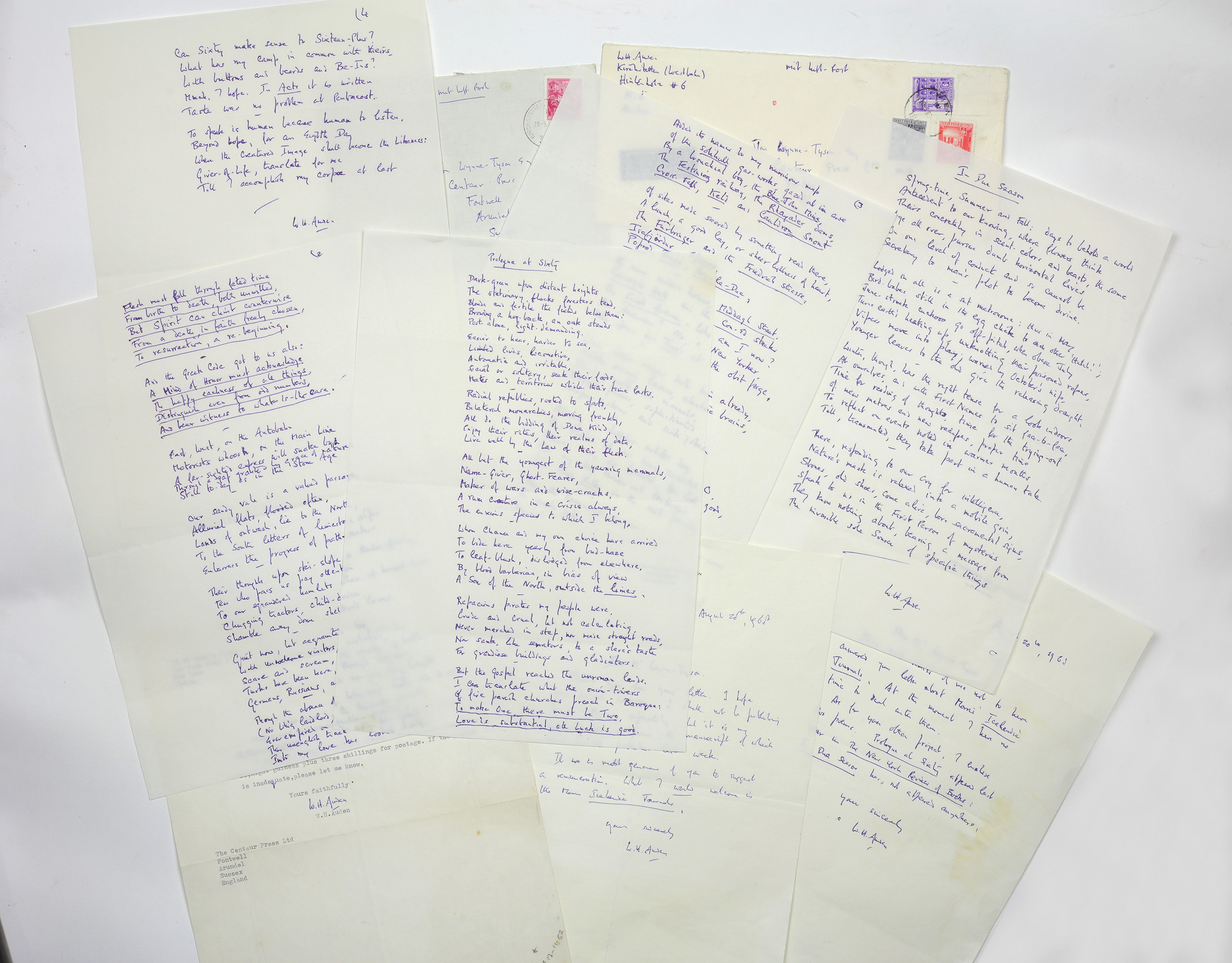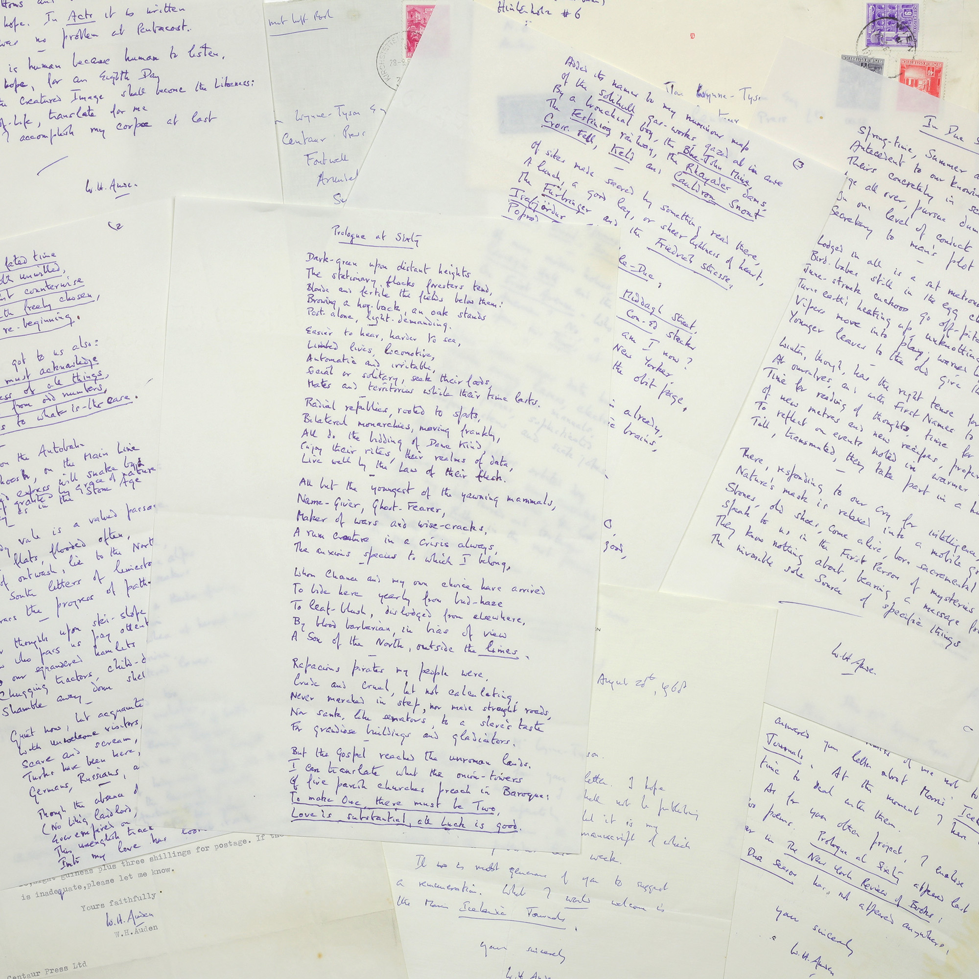 Original autograph manuscripts of two later Auden poems. "Prologue At Sixty" written in blue ink over 4 sheets, 110 lines, and signed by Auden. "In Due Season" written in blue ink on a single sheet, 24 lines, also signed by Auden.With:An autograph letter from Auden to Jon Wynne-Tyson, dated August 20th 1968, sent to accompany the poems' submission to the publisher. With the original envelope addressed in Auden's hand.A second autograph letter from Auden to Wynne-Tyson, dated August 28th 1968, explaining that In Due Season is unpublished. With the original envelope addressed in Auden's hand.And an earlier typed letter from Auden addressed to Wynne-Tyson's Centaur Press, dated November 9th 1962, requesting their new edition of The Poems of William Barnes. All sheets of manuscript and correspondence remain in fine condition, showing only light evidence of being folded into envelopes.