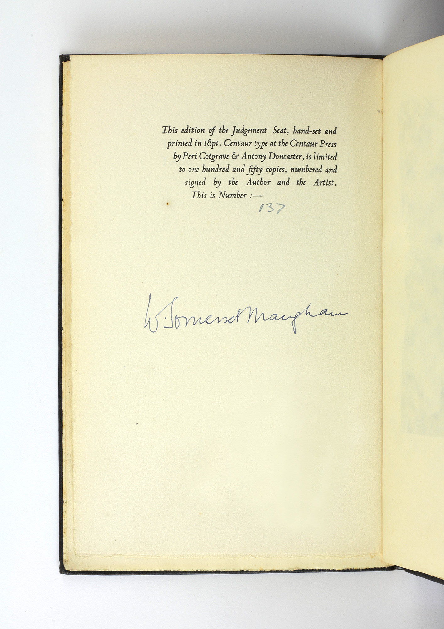 First edition. 8vo. Number 137 of 150 copies signed by both Maugham and the frontispiece artist Ulrica Hyde. Publisher black cloth, lettered gilt. A very good copy indeed with a touch of wear to the corners.