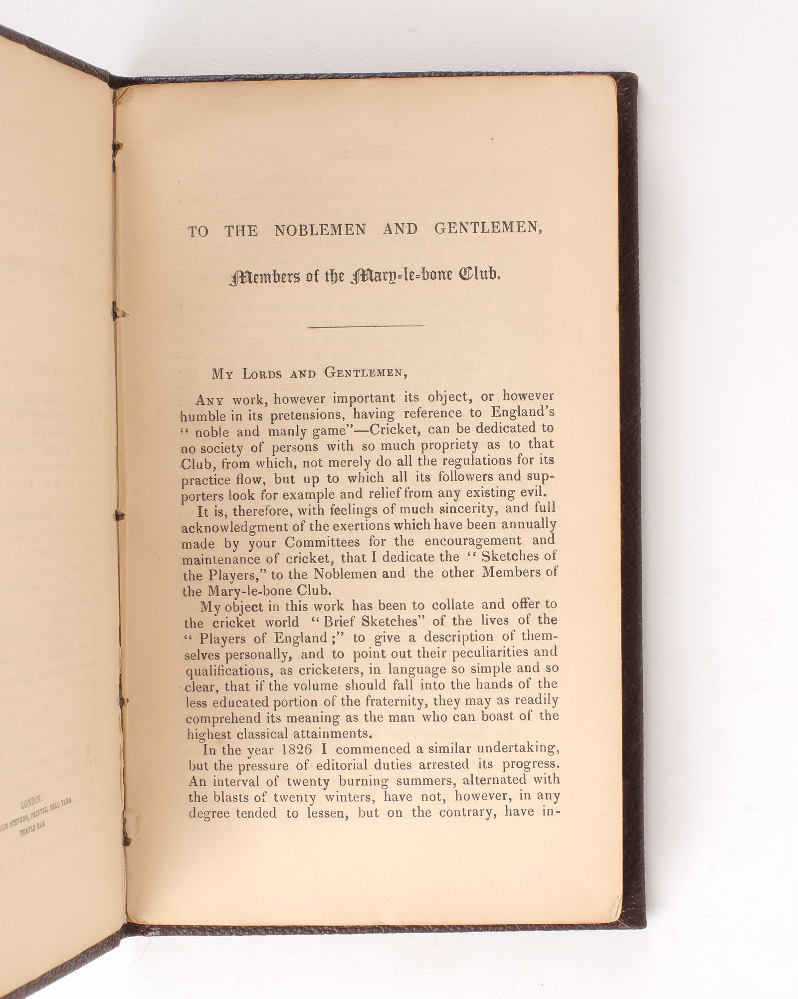 William Denison was cricket's first journalist and his Sketches of the Players, the first book of cricket biography, contains 37 sketches of contemporary players and a more detailed description of the person and talents of Alfred Mynn. Denison was also the first Secretary of Surrey CCC at the time and had firm opinions of how the laws should be developed, such as the universal acceptance of round arm bowling. These views are promoted throughout the work.