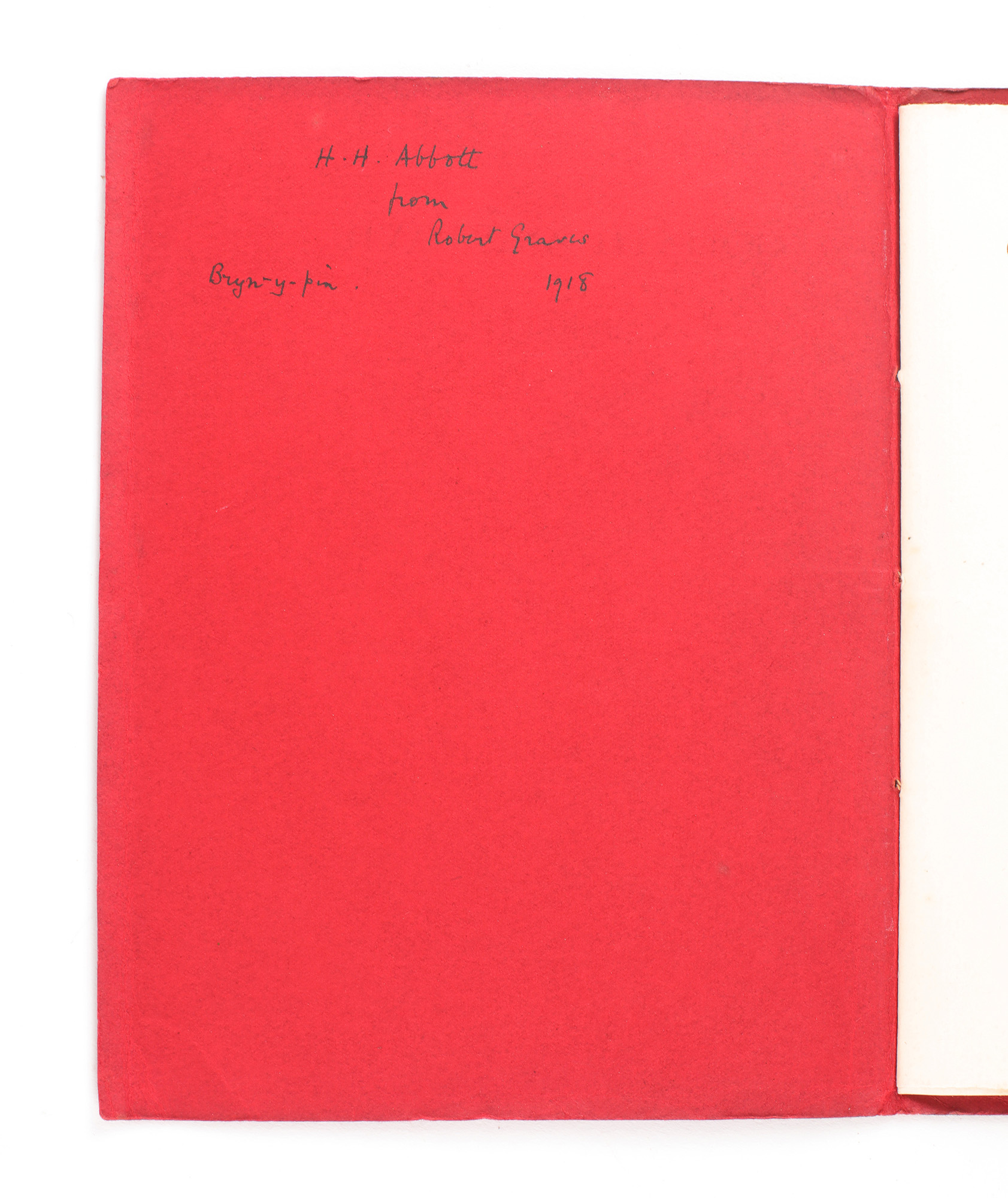 First edition. Original plain oversized red paper wrappers. Author's presentation copy, inscribed to fellow poet Harold Abbott on the inside front cover "H.H. Abbott, from Robert Graves, Bryn-y-pin, 1918". A very good copy indeed, toned to the spine but bright and crisp.