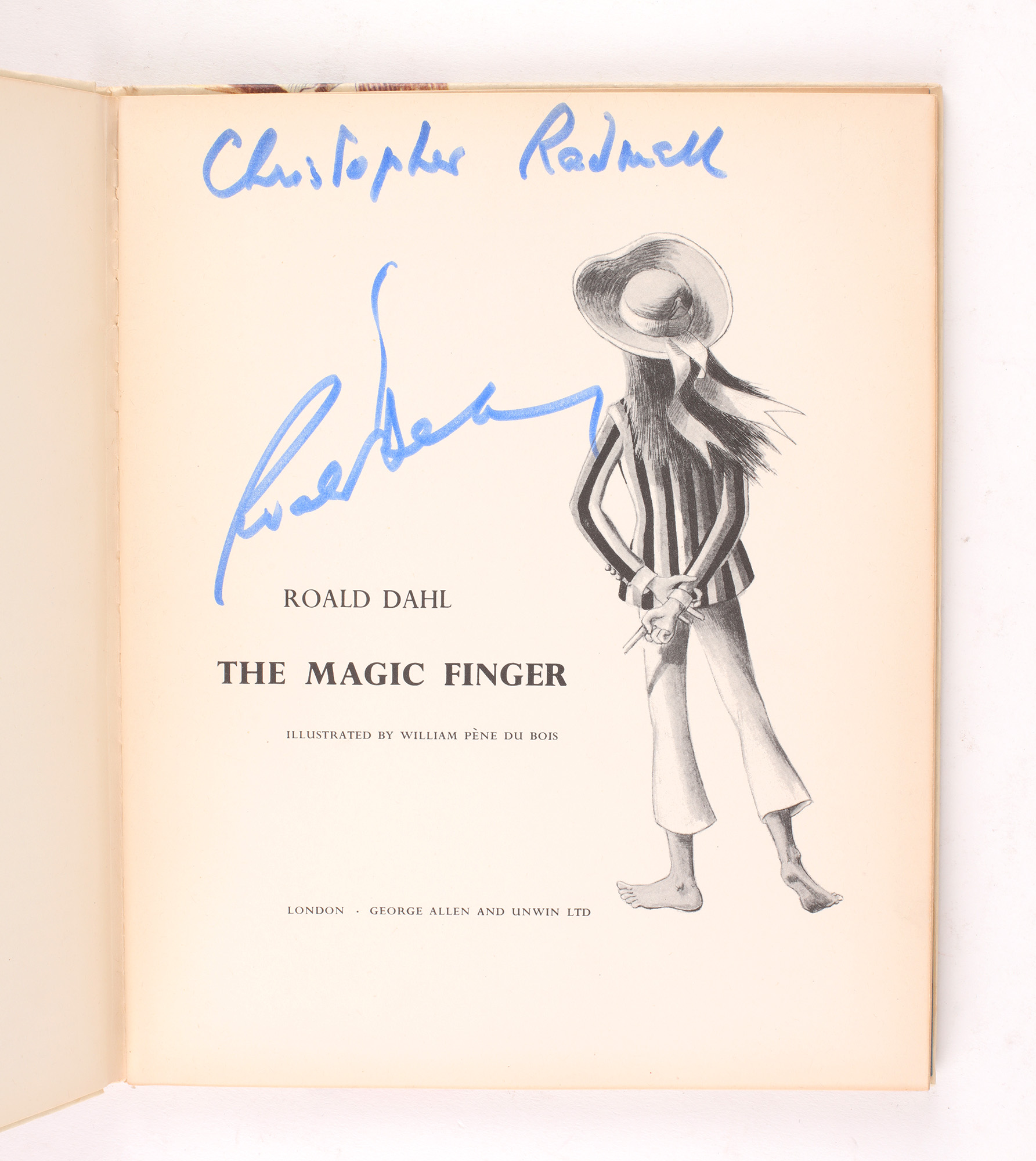 First edition. 8vo. Paper covered boards illustrated in colour. Inscribed by the author on the title page, "Christopher Radmell, Roald Dahl". Many illustrations by William Pène Bois, including pictorial endpapers and some double page illustrations. A near fine copy.