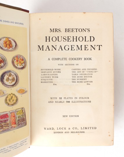 Isabella Beeton (1831-1865) was the eldest child of an extended family of twenty-one, and was required from an early age to see to the domestic arrangements. Shortly after her marriage to Samuel Beeton, a small publisher, she began to contribute to his Domestic Magazine and in time the magazine was issued with a supplement devoted to cookery and domestic economy. In 1861 her writings were published in book form for the first time. It was an immediate success, selling over 60,000 copies in its first year of publication. As well as recipes the book contained advice regarding household management, childcare, etiquette, entertaining and the employment of servants. Surely one of the most famous of all cookery books.