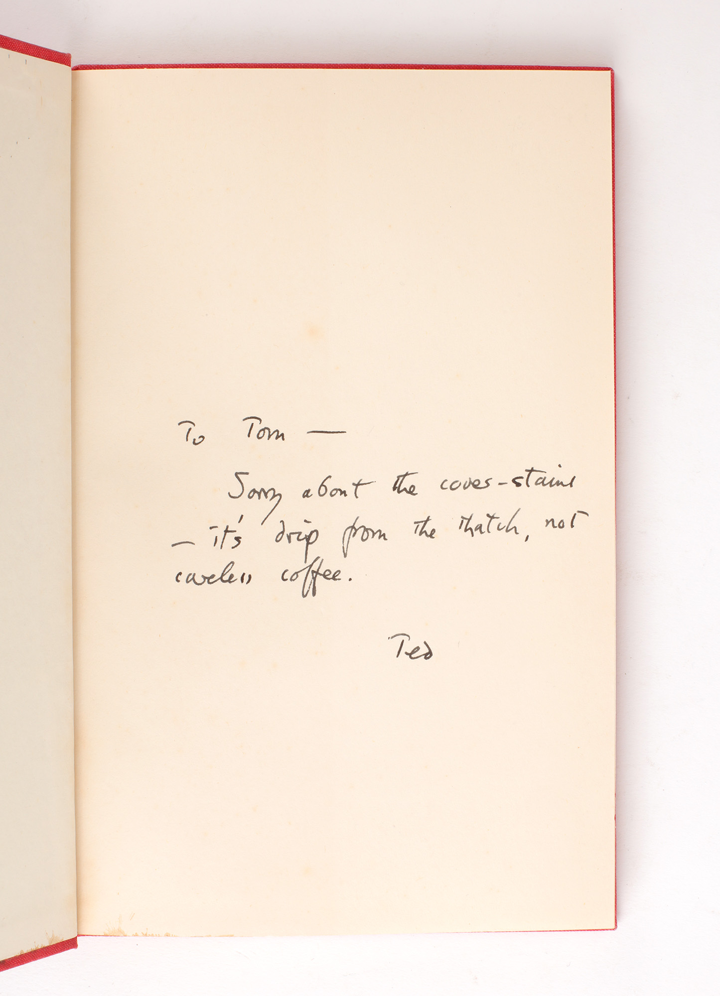 First edition. Original red cloth with gilt titles in dustwrapper. Presentation copy, from Ted Hughes, the author's husband and editor. Inscribed on the front endpaper for his uncle Thomas Farrar, "To Tom - Sorry about the cover-stains - it's drip from the thatch, not careless coffee. Ted". A near fine copy in a near fine dustwrapper. Both book and dustwrapper are fresh and clean, aside from the thatch drip Hughes mentions in the inscription. This chiefly effects the spine and lower panel of the dustwrapper and the bottom edge of text block.
