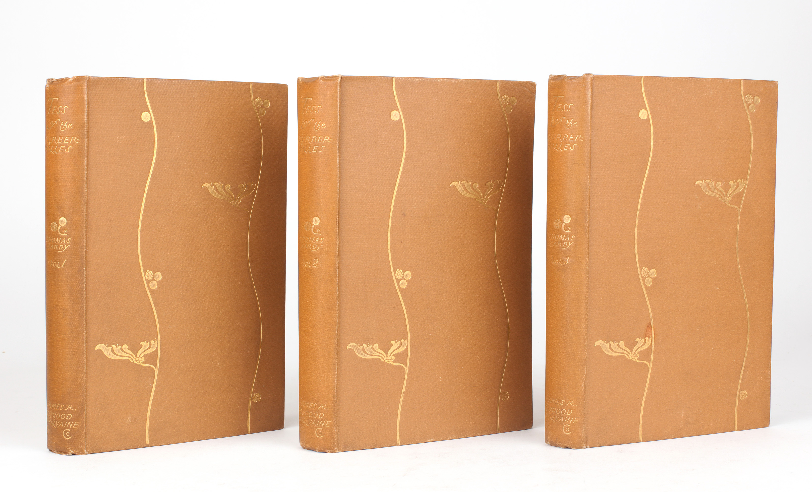 First edition, first issue. Three volumes. 8vo. Original publisher's honeysuckle cloth, with gilt designs by Charles Ricketts. Inscribed to the first blank of the third volume by Ricketts, "To Rylis, C.S. Ricketts". A near fine copy. Spine very slightly cocked, and light pushing to spine ends, but a very crisp and bright set. Front hinges of vol I and II with splits, but still sound and internally very fresh indeed. Housed in a bespoke quarter morocco clamshell box.