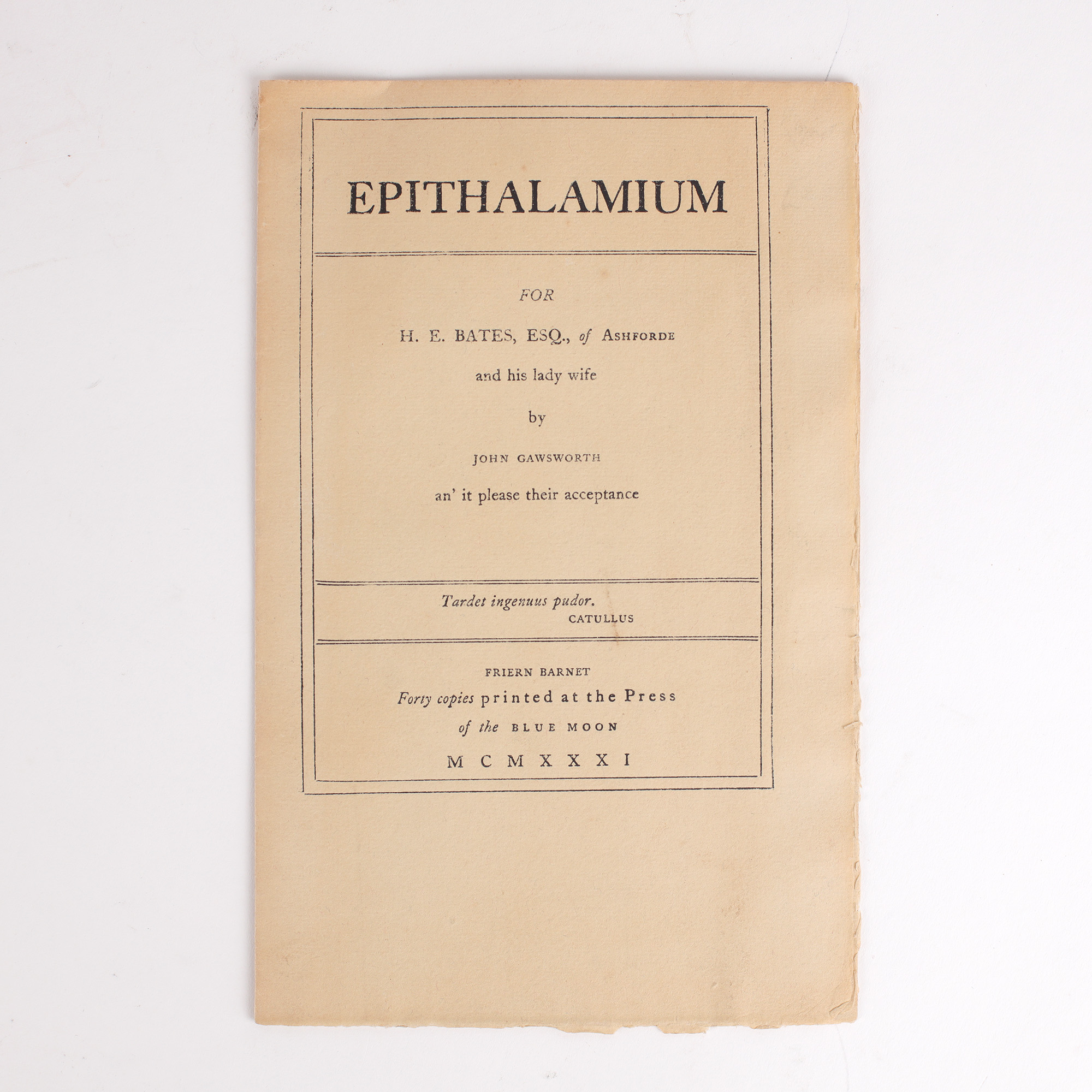 A very attractive 2 page poem, privately printed by Gawsworth on this occasion of H. E. Bates's marriage to Madge Cox in 1931.