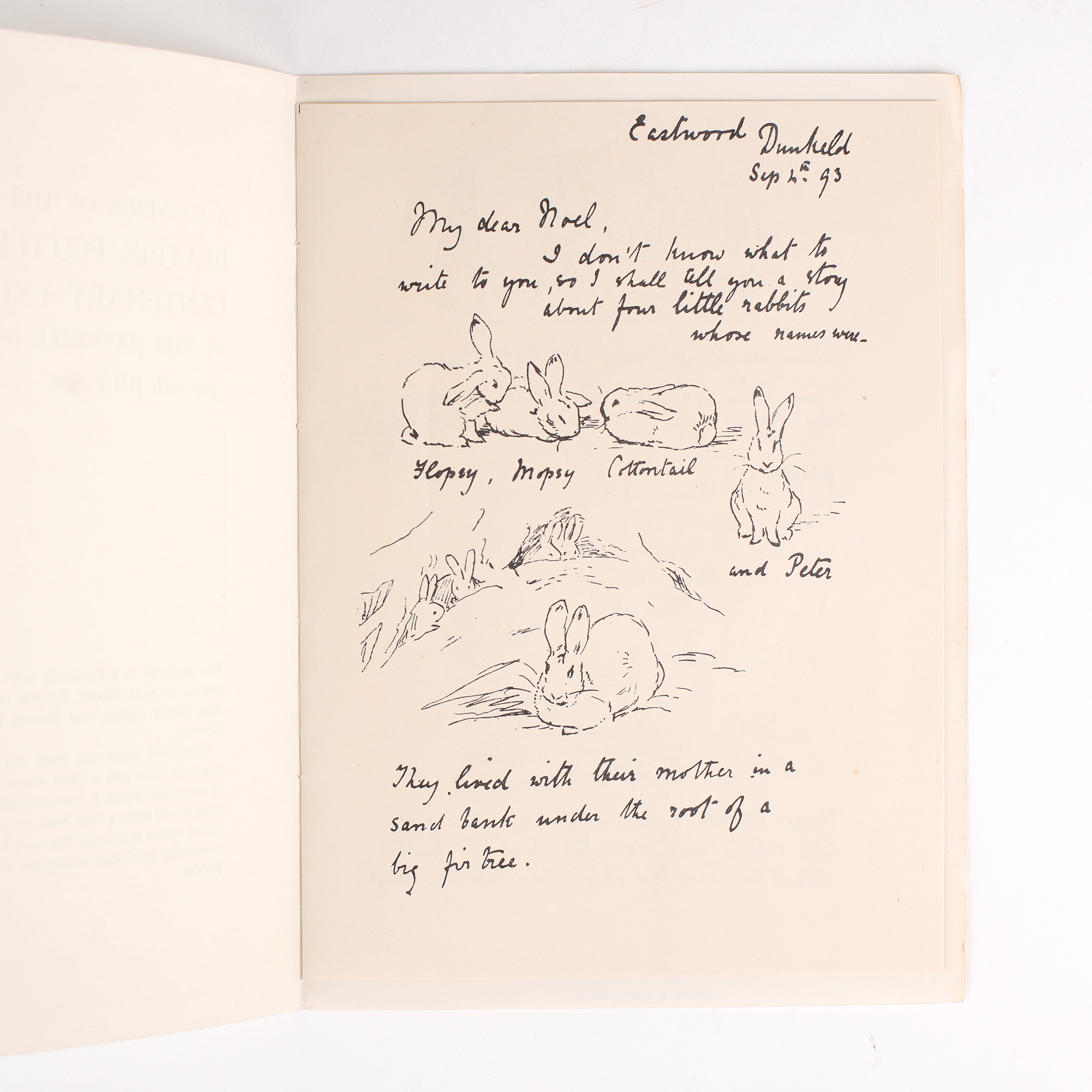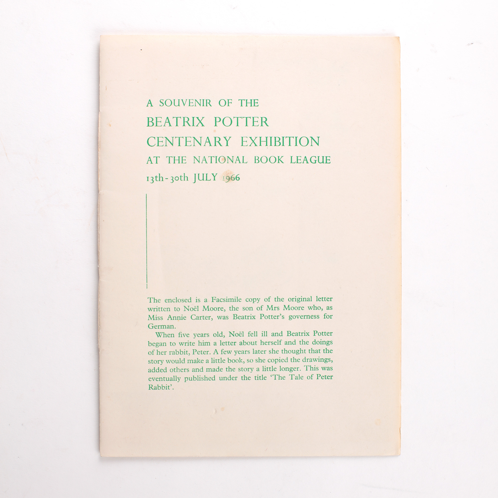 To mark the centenary of Beatrix Potter's birth, the National Book League, in conjunction with Warne's, published a facsimile of the picture letter sent to Noel Moore, the son of Potter's German governess, which records the first appearance of Peter Rabbit.