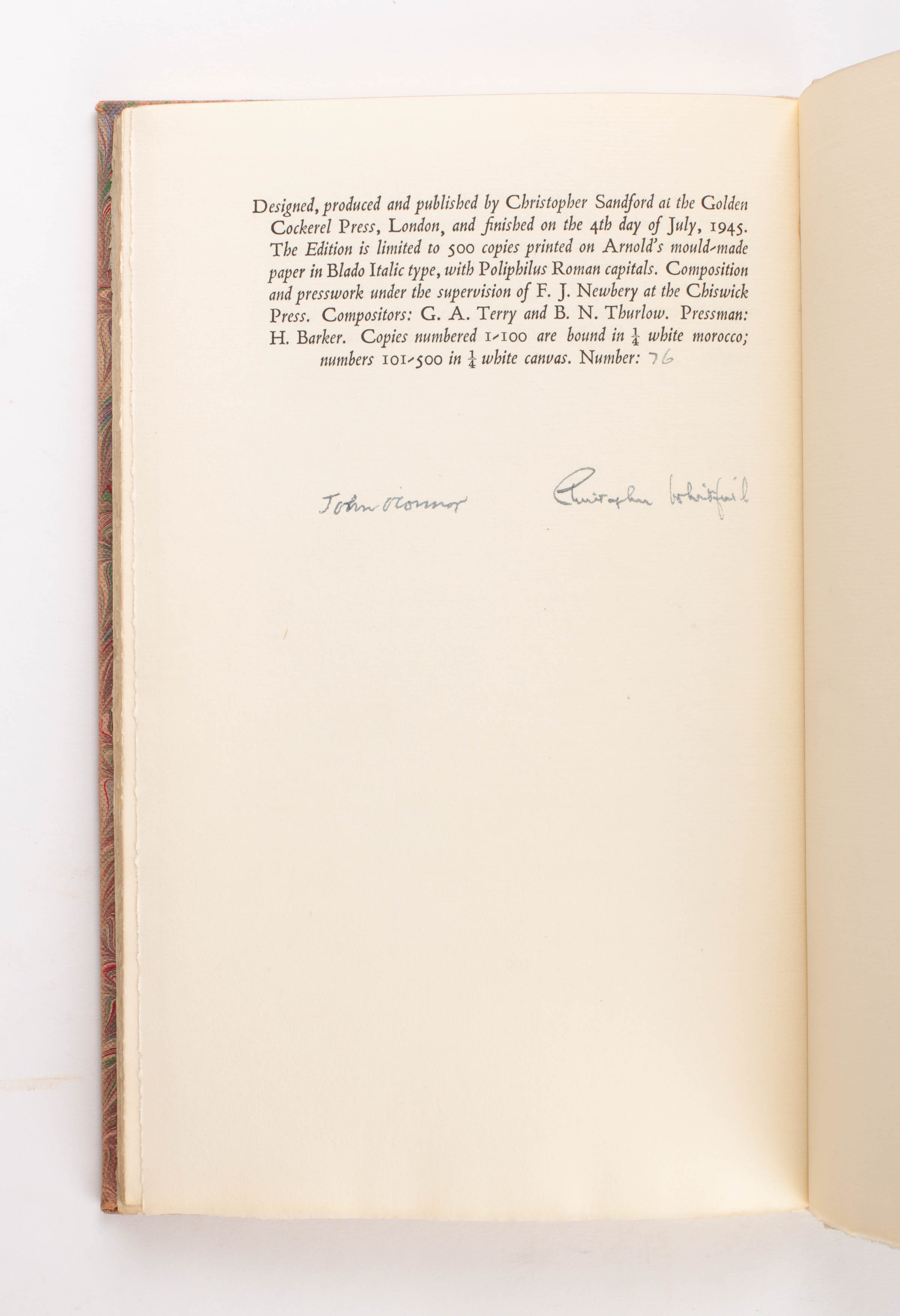 First edition. 8vo. Number 76 of 100 special copies, bound in quarter white morocco over marbled cloth, lettered gilt to the spine and signed by both author and illustrator. In the publisher's original cream cloth slipcase. Wood engravings by John O'Connor throughout. A very good copy in a very good slipcase. Previous owner's bookplate to front pastedown.