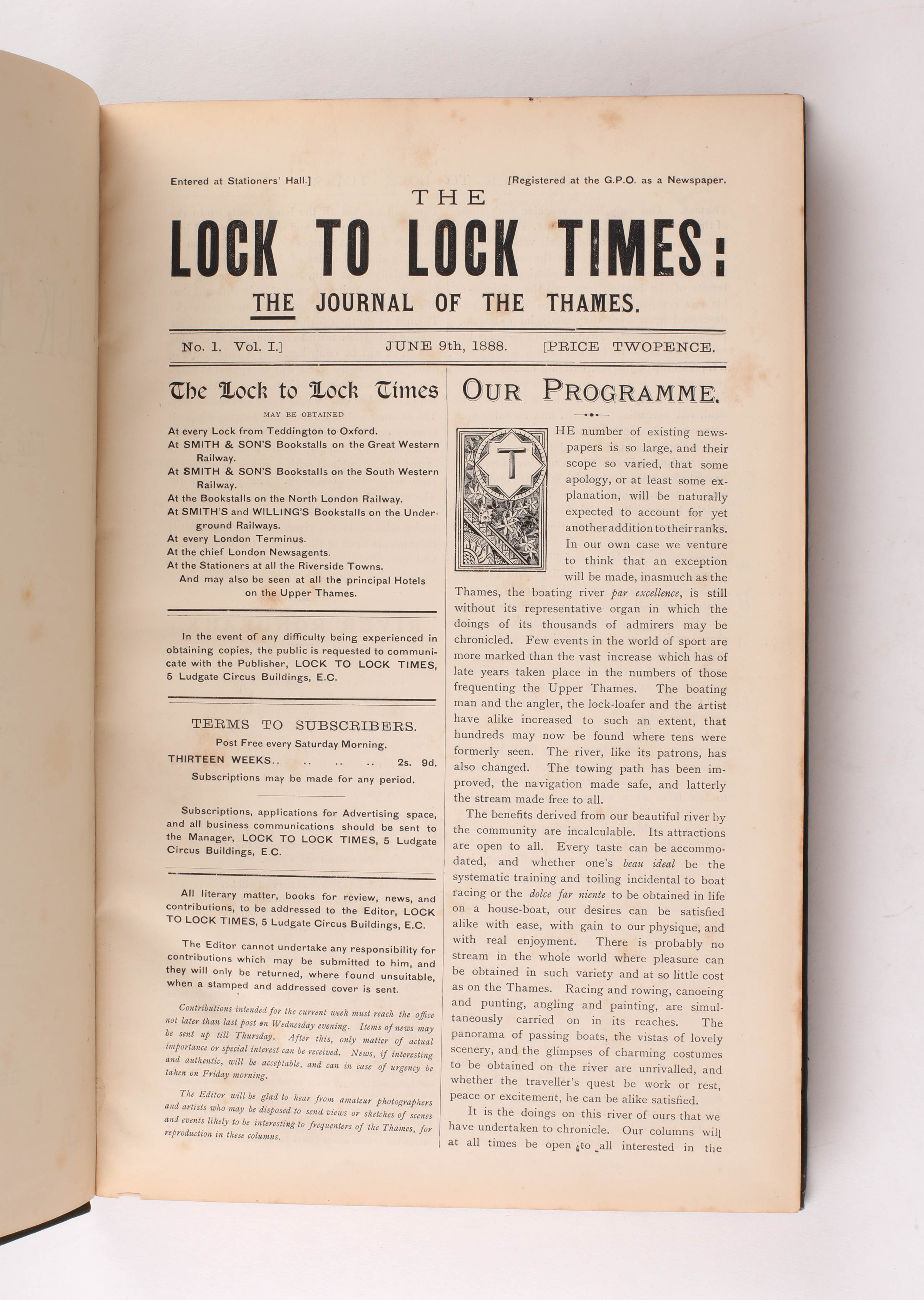 The Lock to Lock Times was founded in 1888 with the object of supplying the long-felt want of an organ of news concerning the doings of Boating-men, Artists, Anglers, and that large class of persons who frequent the River Thames. The venture was from the first a conspicuous success. During the first twelve months of its existence, the proprietors found it necessary to twice increase the size of the paper, while the number of illustrations was at the same time considerably added to - Advert in Krausse's Pictorial History of the Thames.
