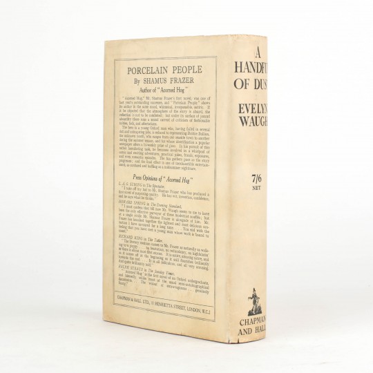 One of the author's scarcest books, particularly so in such a fine dustwrapper. Critically regarded as the high point of Waugh's literary output and as one of the great novels of the twentieth century. Mainly written in Morocco, the narrative seems to have come to Waugh quite easily, as he wrote to Katherine Asquith, "I peg away at the novel which seems to me faultless of its kind... Comic English character parts too easy when one gets be thirty." However, later he wrote "I have just killed a little boy at a lawn meet and made his mother commit adultery & his father get drunk so perhaps you won't like it after all." The title went through several iterations before purloining the phrase from T.S. Eliot's The Waste Land; "I will show you fear in a handful of dust."