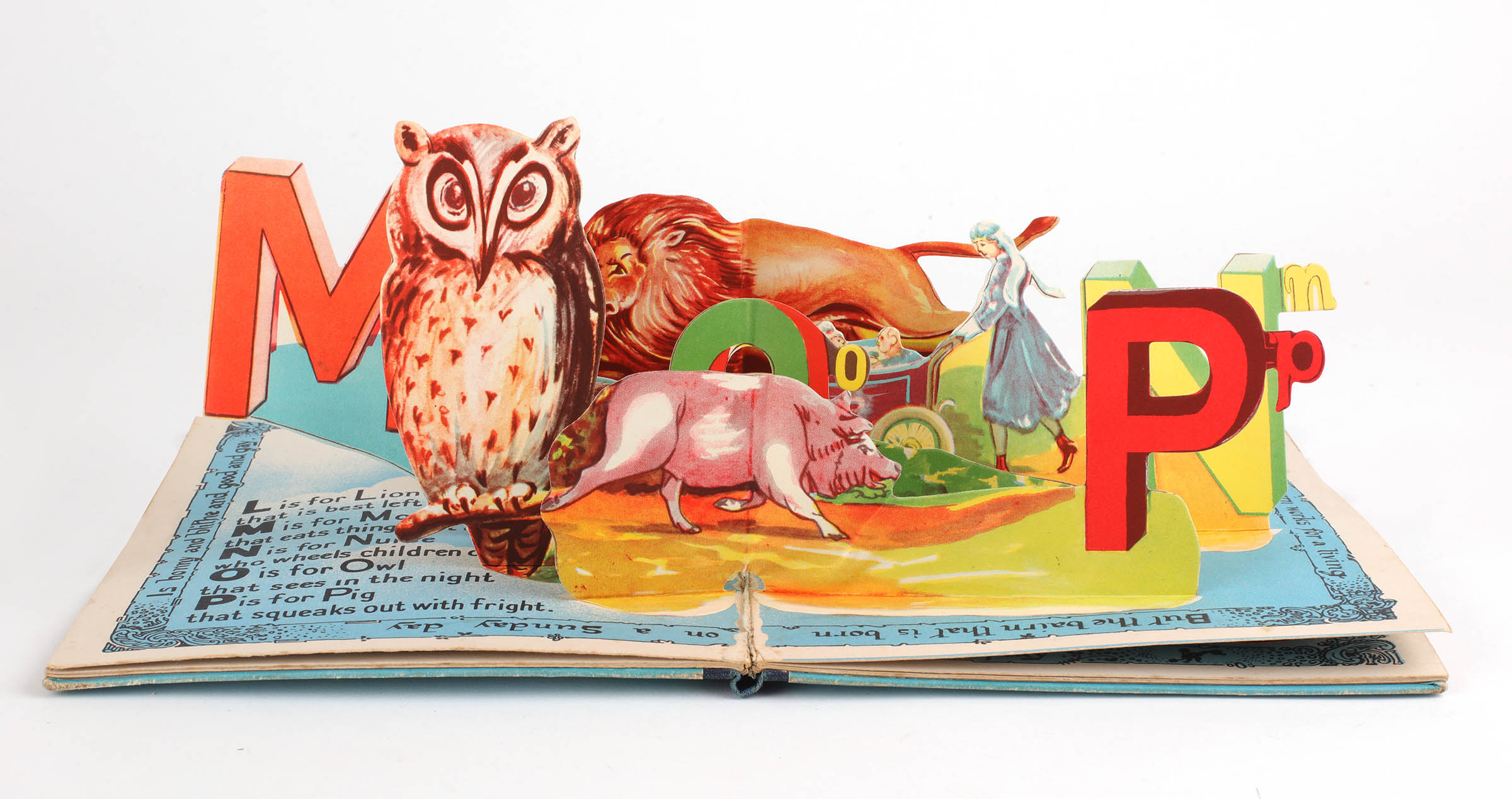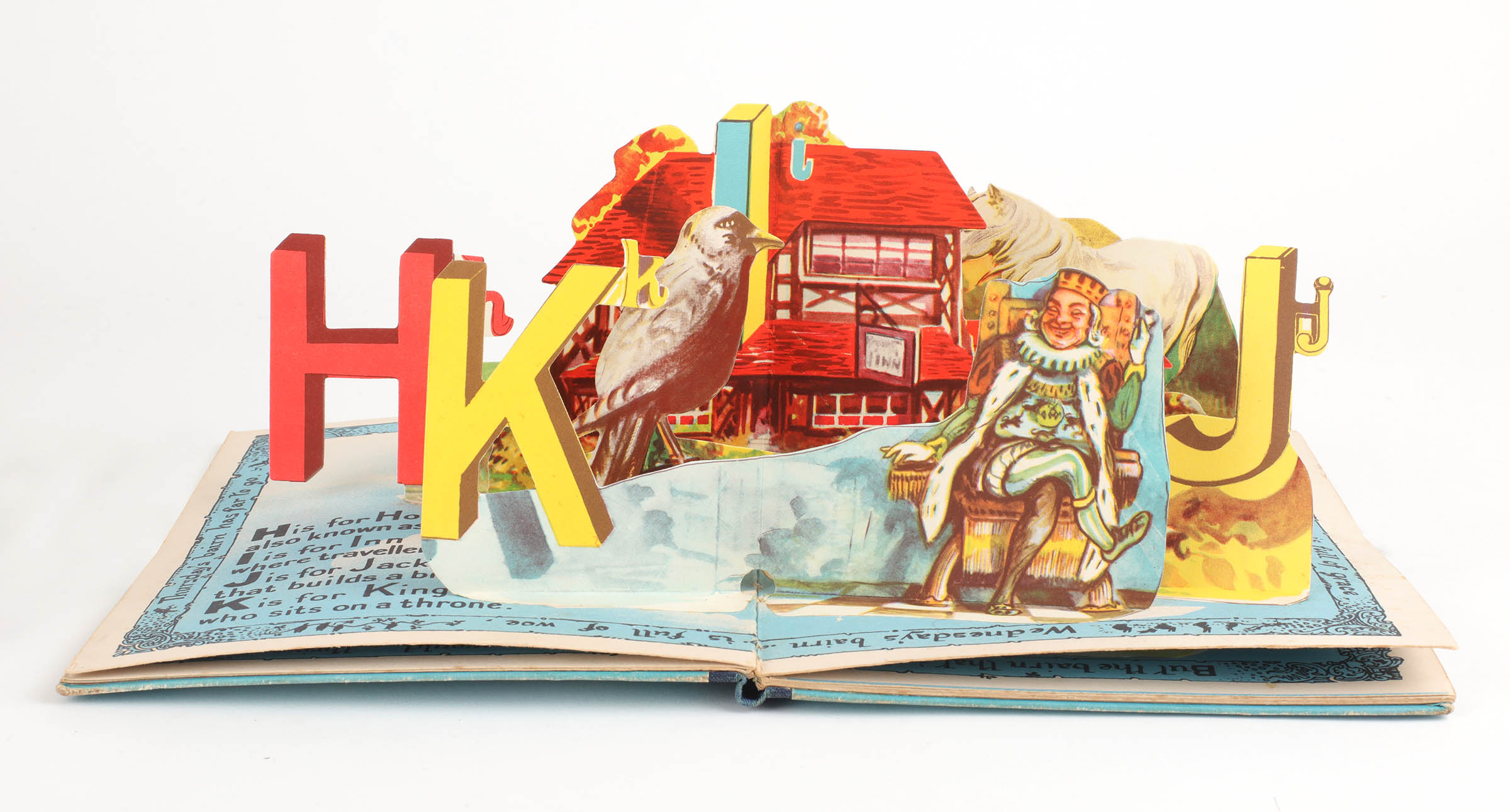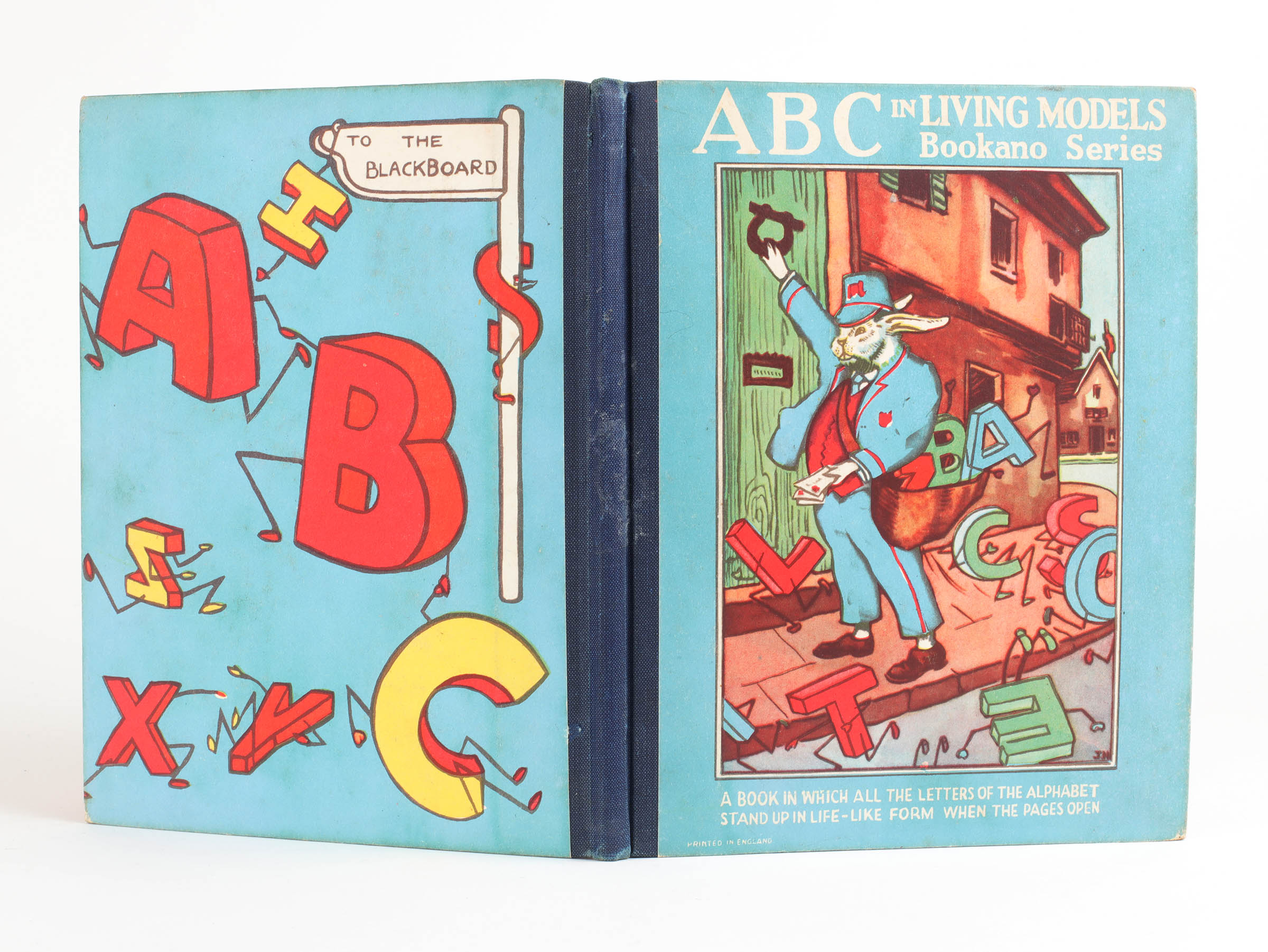 This alphabet book is one which describes itself as "A book in which all the letters of the alphabet stand up in life-like form when the pages open." Cloth spine and paper covered boards illustrated in colour. Pictorial endpapers initialled by JH. Seven double page pop-up scenes with brightly illustrated letters and images. A bright, near fine copy with a touch of wear to the spine.