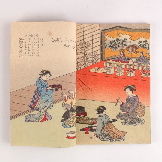 Beautiful calendar printed on 13 folded crepe paper pages, tied with pale blue silk. Woodblock double page colour prints of different scenes for each month. A bright copy, in fine condition.