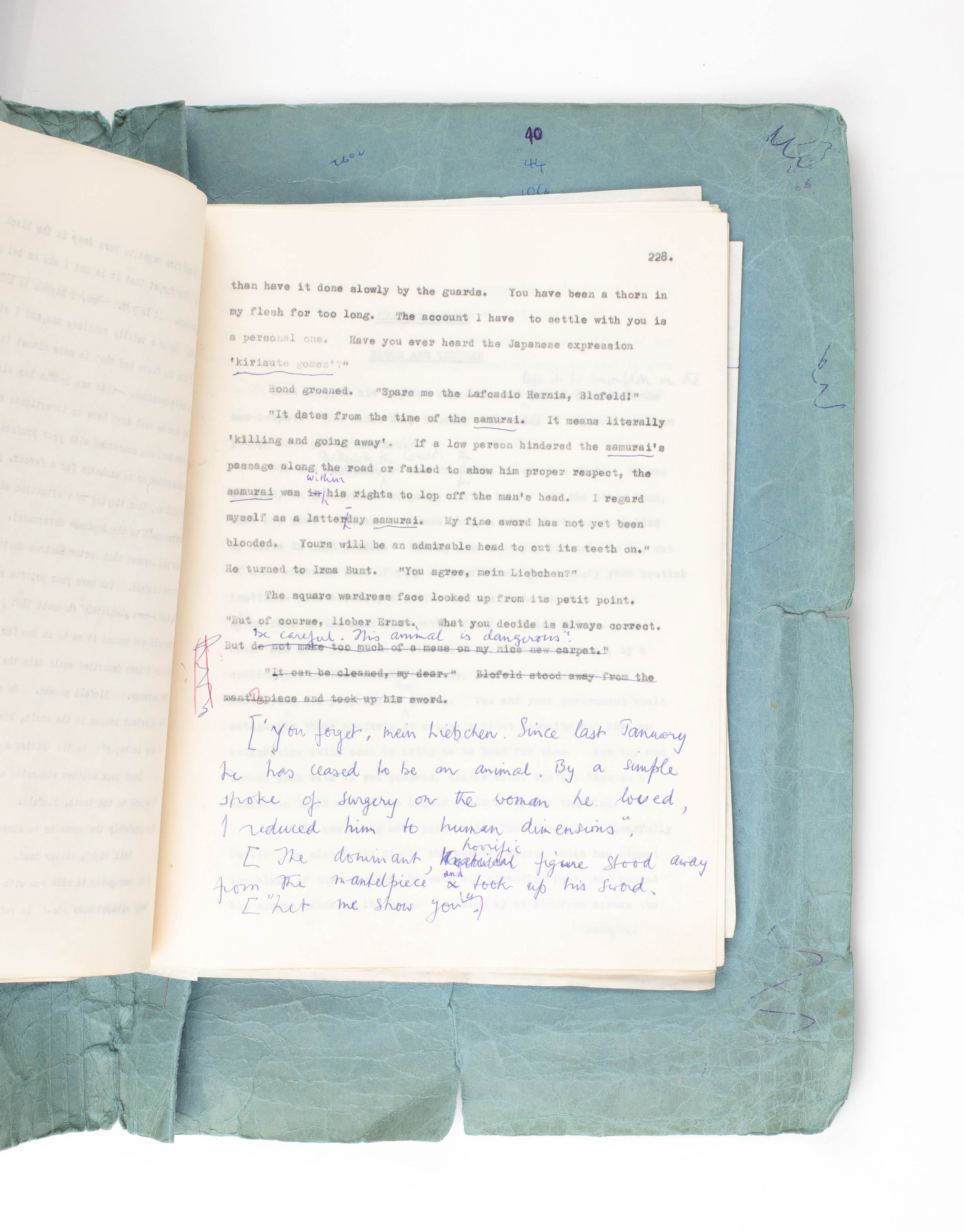There are three notable emendations in this manuscript. Fleming's deletion of the poisonous attributes of tobacco is interesting, given the author's liking for cigarettes. The original deleted text for this particular plant as "listed by Customs and ExciseÂ… as Imported by Doctor Guntram Shatterhand", reads "Tobacco (Nicotiana glauca and N. tabacum): N. glauca is a small tree, N. tabacum is the commercial bush. Both yield toxic alkaloid, nicotine. May be fatal, due to exhaustion after retching, diarrhoea, muscular weakness, violent cardiac palpitations". Later in the manuscript, at the conclusion of chapter 19 ("The Question Room"), the text has been significantly reworked and expanded with the addition of a paragraph which Fleming uses to draw to a crescendo, Blofeld's victory speech as he prepares to decapitate Bond with a samurai sword. Finally, in the following chapter ("Blood and Thunder"), there is Blofeld's grand exposition of his evil scheme. This too, has been significantly revised by Fleming, portraying Blofeld less as pantomime villain and more urbane, villainous, sophisticated. As a whole the author's changes throughout the manuscript give a revealing insight in to his creative process, particularly character development, in the way he fleshes out and delicately engineers the explanations and motivations of Bond's most famous enemy.