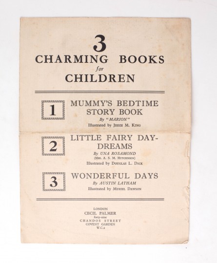 Publisher's advertising leaflet, one sheet folded into 4 sides. Advertising "3 Charming Books for Children", the first of which is Mummy's Bedtime Story Book, by 'Marion.' Includes a black and white draing by JMK, as well as others by Murial Dawson and Dougles Dick. In very good condition, with some edge wear.