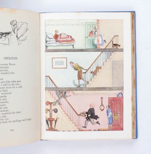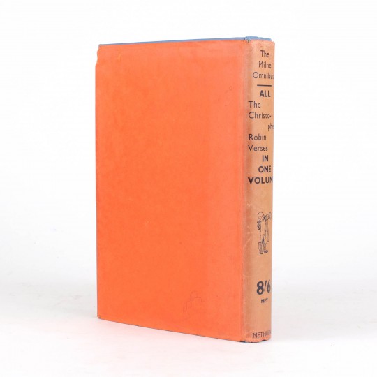 First edition of this combined book of verses, with new colour illustrations by E.H. Shepard and a new preface by A.A. Milne, first issue with blue cloth, gilt lettering and vignette. This copy complete with the original pictorial dustwrapper, with printed price of 8/6 net, and original orange printed protective wrapper. 8vo. Top edge blue. Twelve colour plates and many line drawings by E.H. Shepard. A near fine copy, with some spotting to the page margins, in a very good dustwrapper indeed, which due to the protection of the outer dustwrapper is clean and bright, save for a few marks to the rear and some creasing to the flaps. The printed outer dustwrapper is very good, with some general wear.