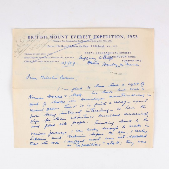 An autograph letter, signed to translator Malcolm Barnes in blue ink (approximately 200 words), on "BRITISH MOUNT EVEREST EXPEDITION, 1953" notepaper, crossed through with Hunt's current address, "Highway Cottage, Aston, Henley on Thames".Hunt discusses experiences of mountaineering "in Sikkim and Kashmir before the war. I realise that the ones I enjoyed most were not labeled as Expeditions at all; they were the treks undertaken at leisure through those wonderful mountain lands, meeting local folk, absorbing the atmosphere, being vividly aware of it all." He praises Norman Hardie's new book, describing it as "intensely interesting" and saying "it is such a relief... to have the stage for these adventures described discerningly and filled with people". A near fine letter, with a small pencil annotation to the top left corner.