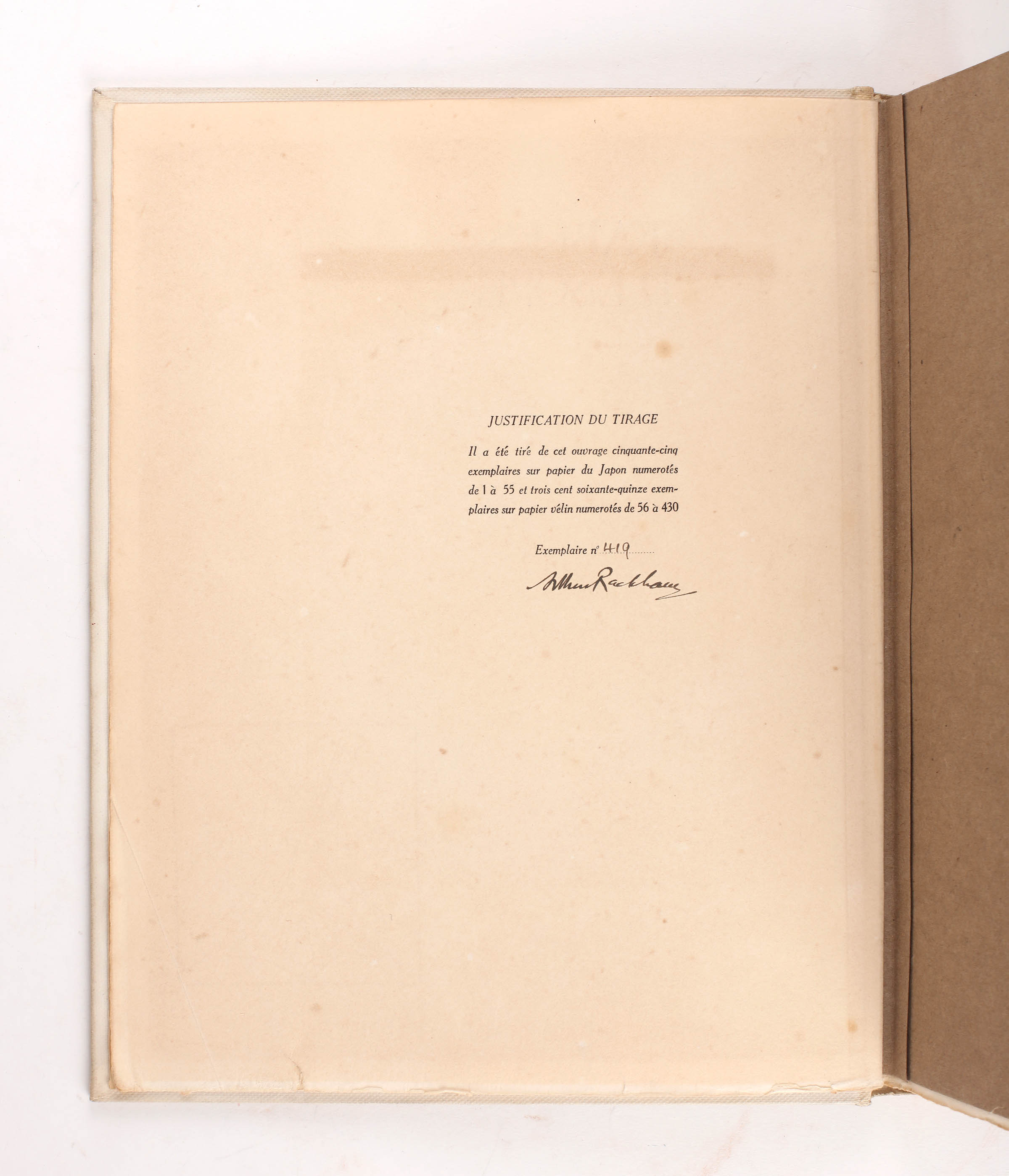 First French language edition illustrated by Rackham. Signed limited edition. Copy number 419 of 430. Cream cloth with gilt titles to upper cover and spine. Top edge gilt, others untrimmed. Colour frontispiece and twelve further colour illustrations tipped in on brown art paper as well as numerous black and white illustrations by Rackham. A very good copy, tanned to spine and with short closed tears to the half title, a small scratch to the frontispiece and two plates with creased corners, end papers neatly replaced.
