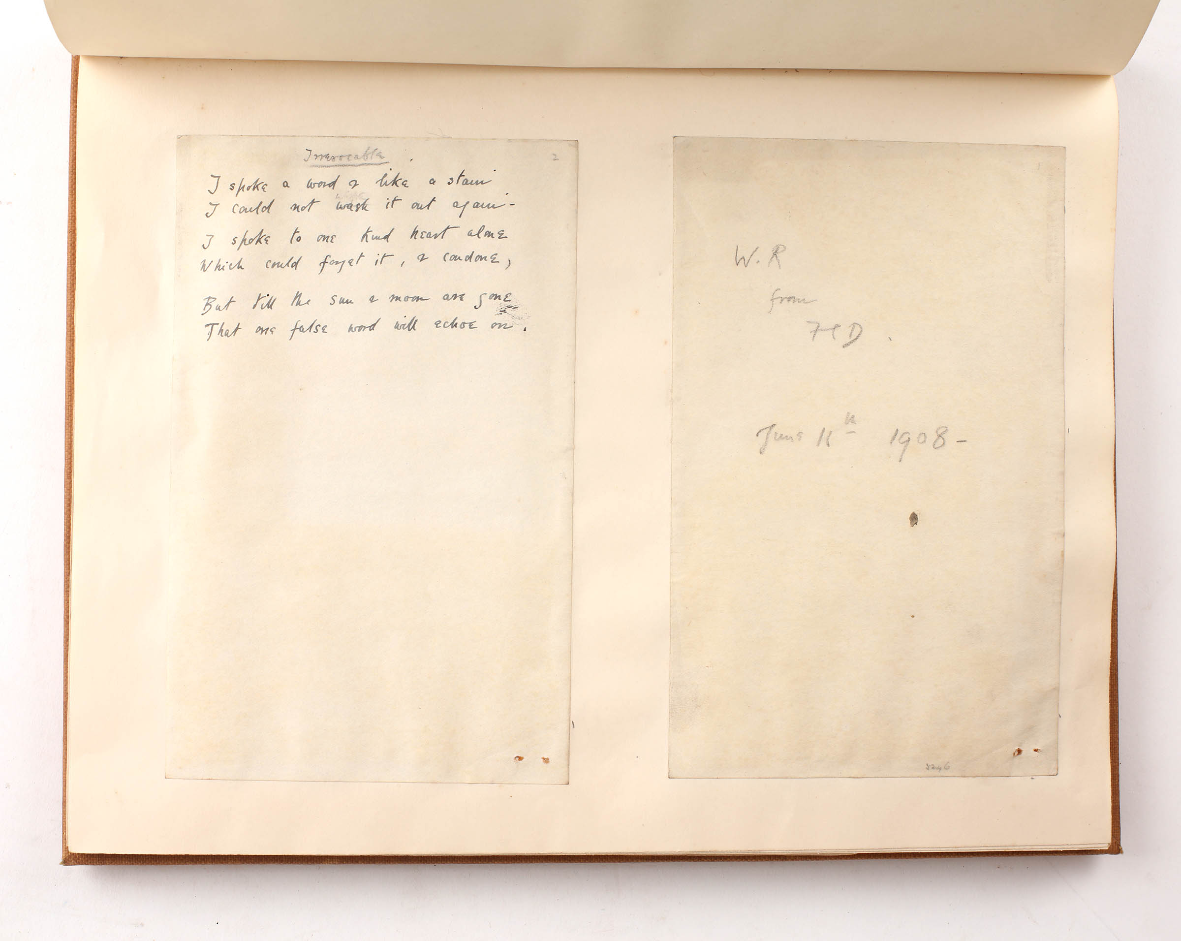 The manuscripts divide themselves naturally into four sections. The first section comprises seventeen poems written on nineteen pages of octavo note paper, plus a single leaf with the presentation inscription "W.R. from FCD June 11th 1908", mounted onto pages, two to a page. Many are written in pencil and appear mostly fair copies.