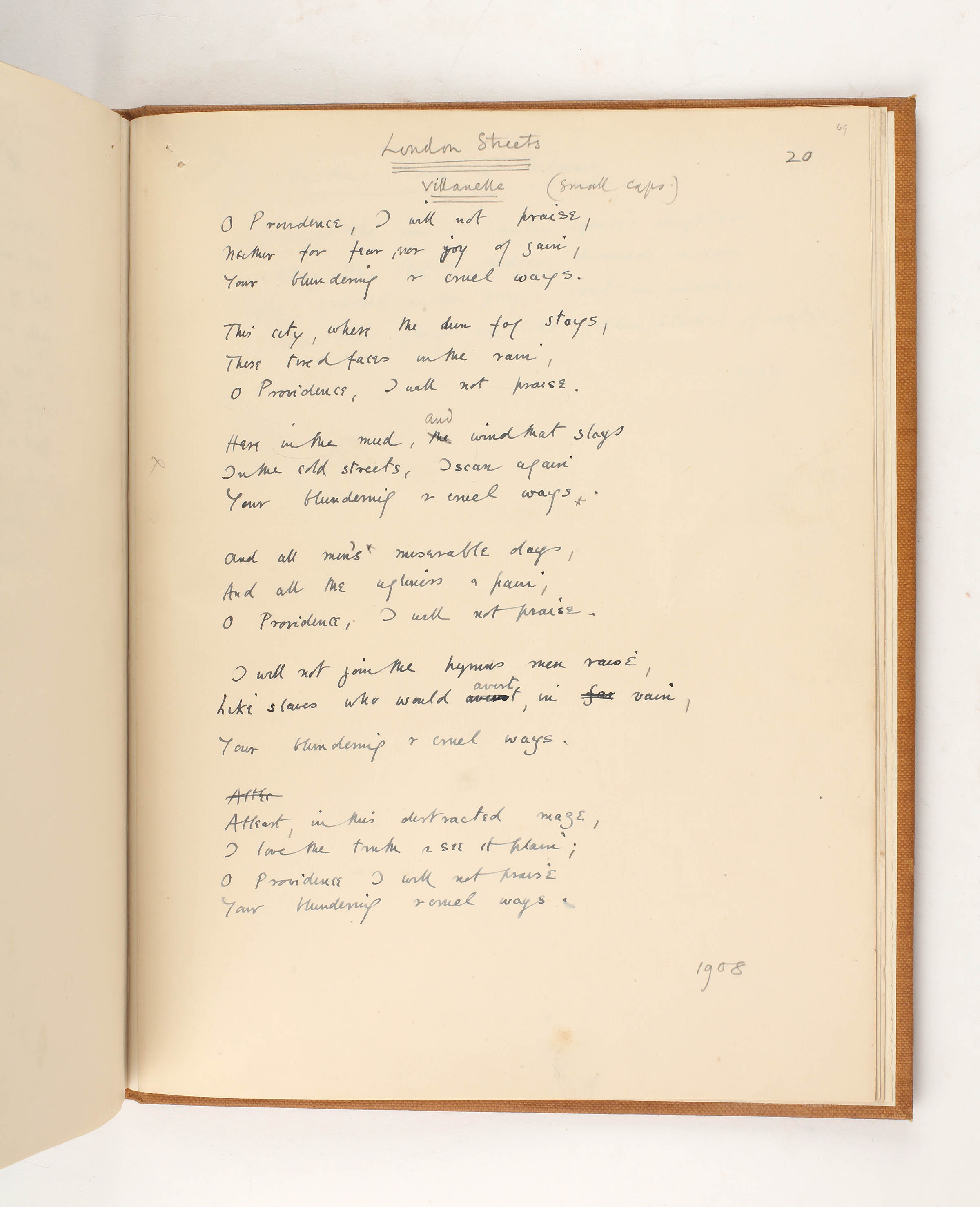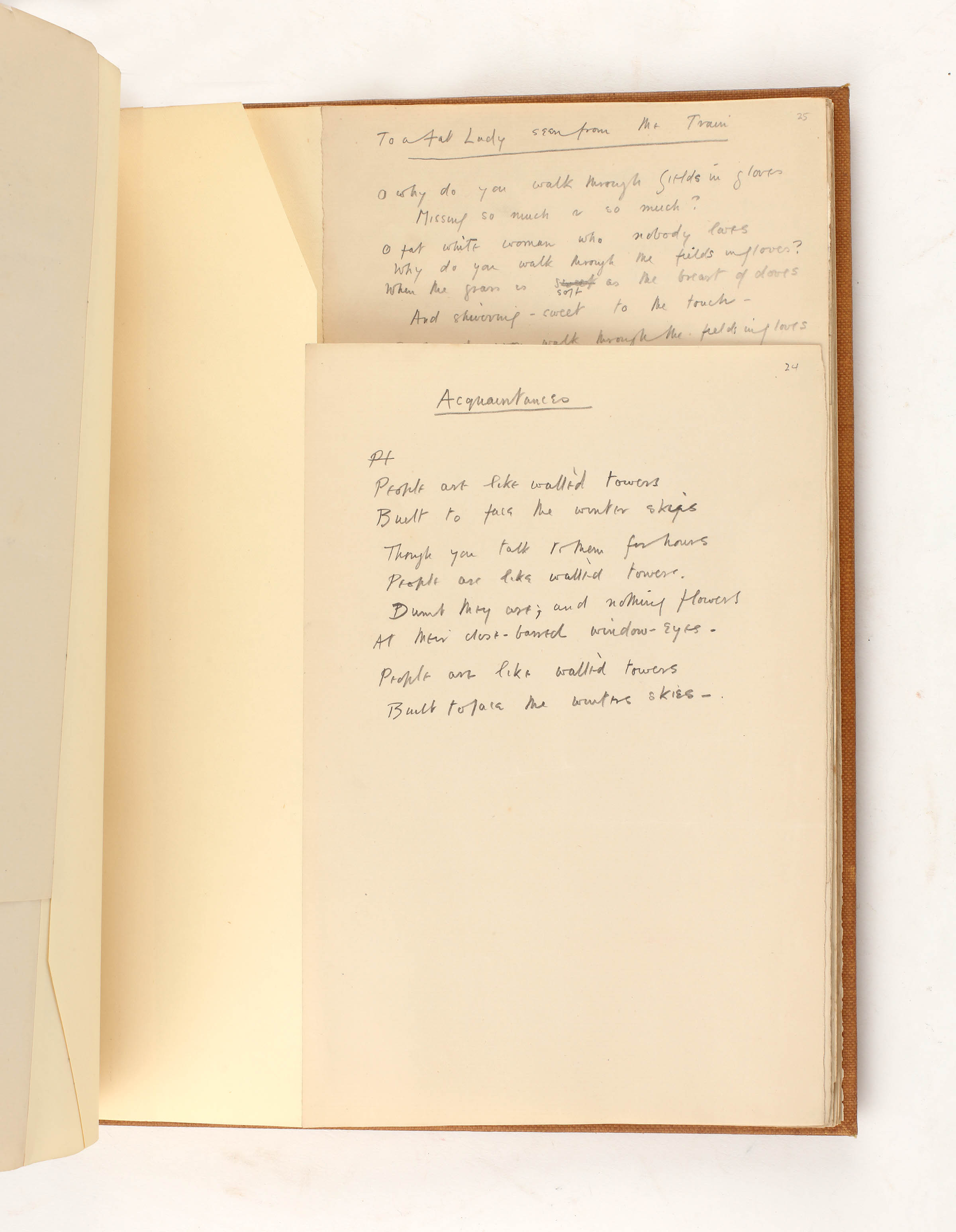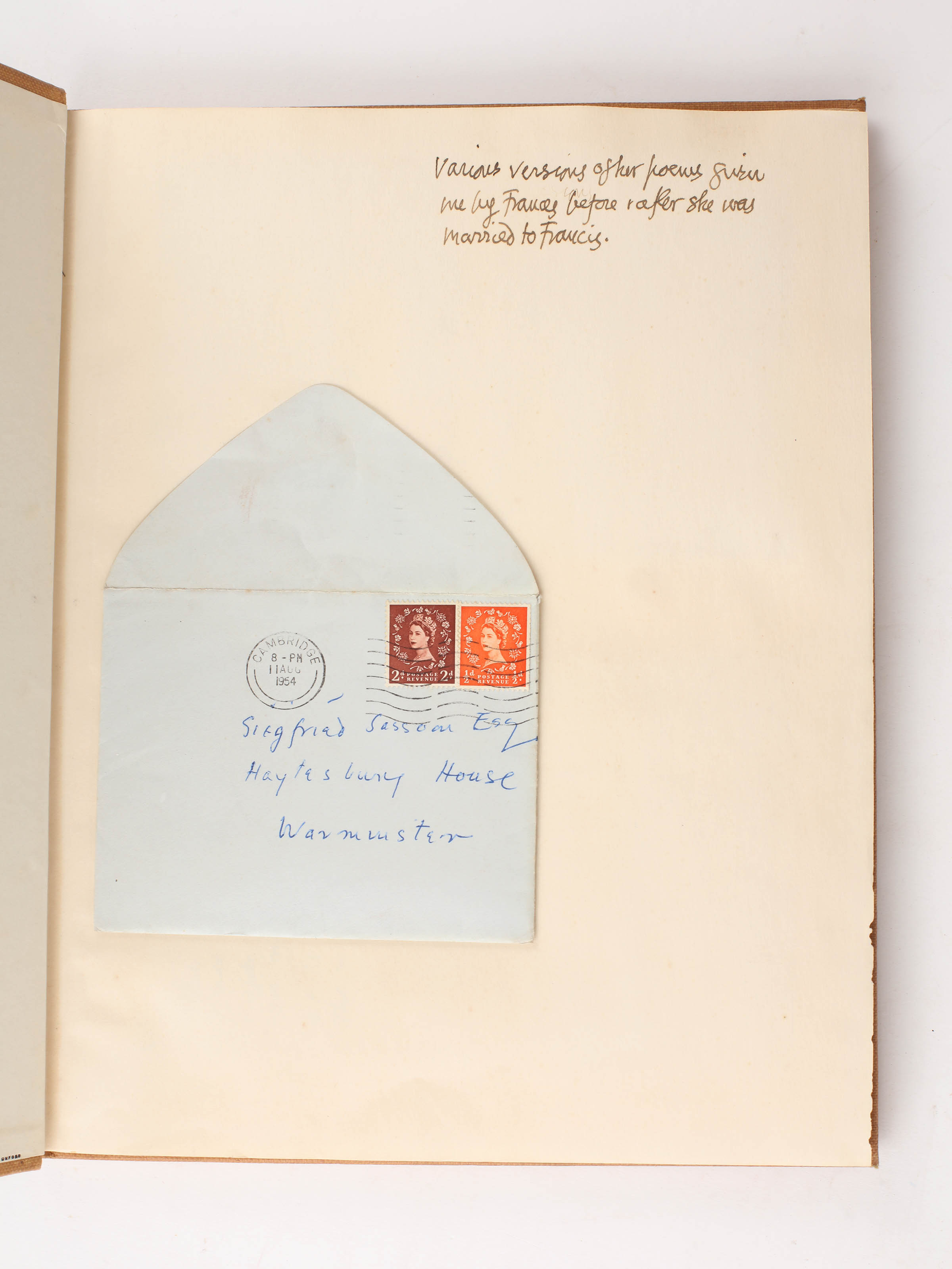 PROVENANCE: William Rothenstein (1872-1945, artist and writer, presentation inscription from Cornford on first mounted sheet and a note by Rothenstein to the fort endpaper, "Various versions of her poemes given to me by Frances before + after she was married to Francis", presumably bound up by Rothenstein); Siegfried Sassoon (presuambly acquired from Rothenstein's estate before 1954, letter from Cornford to Sassoon refering to his possession of her manuscripts); Private collection.