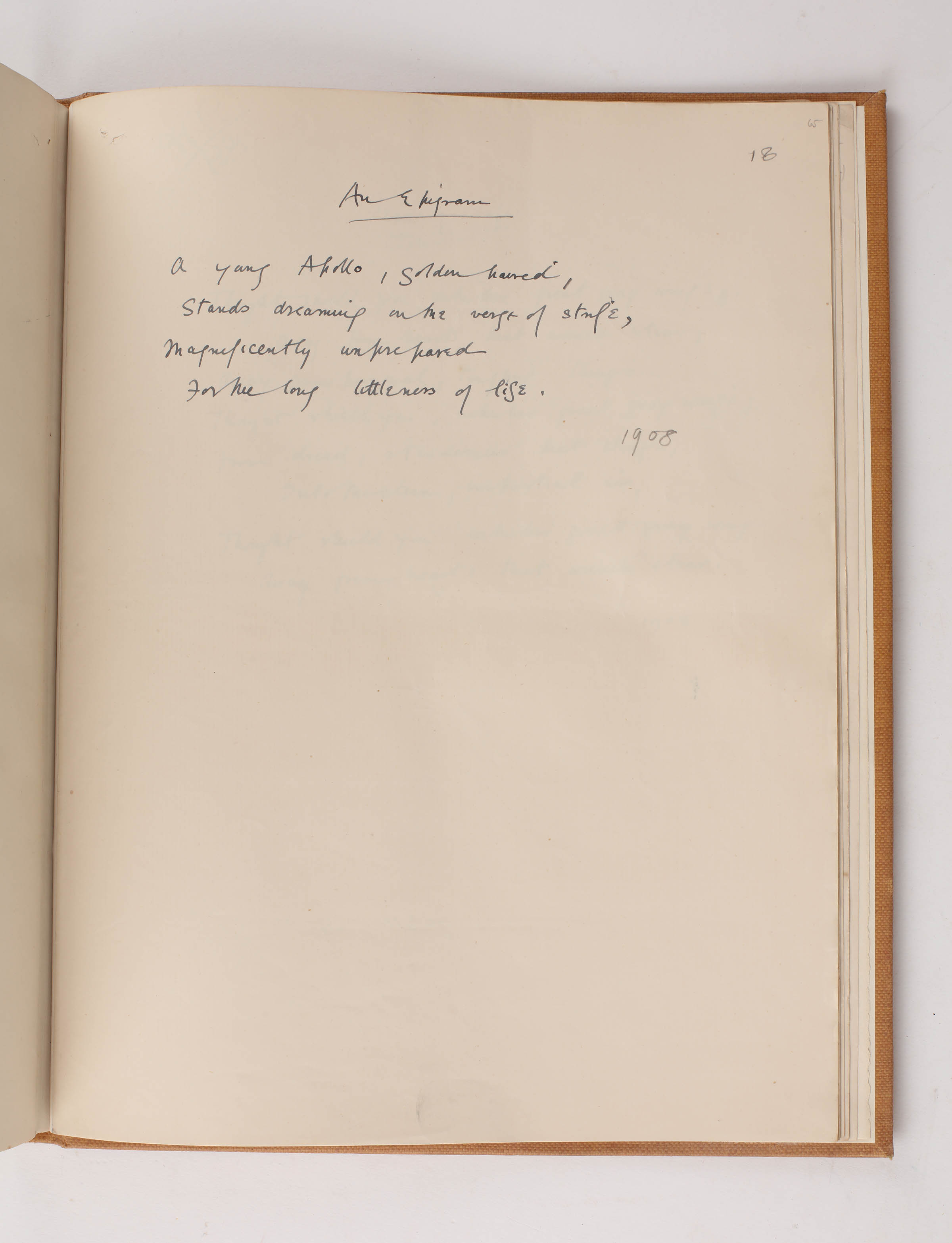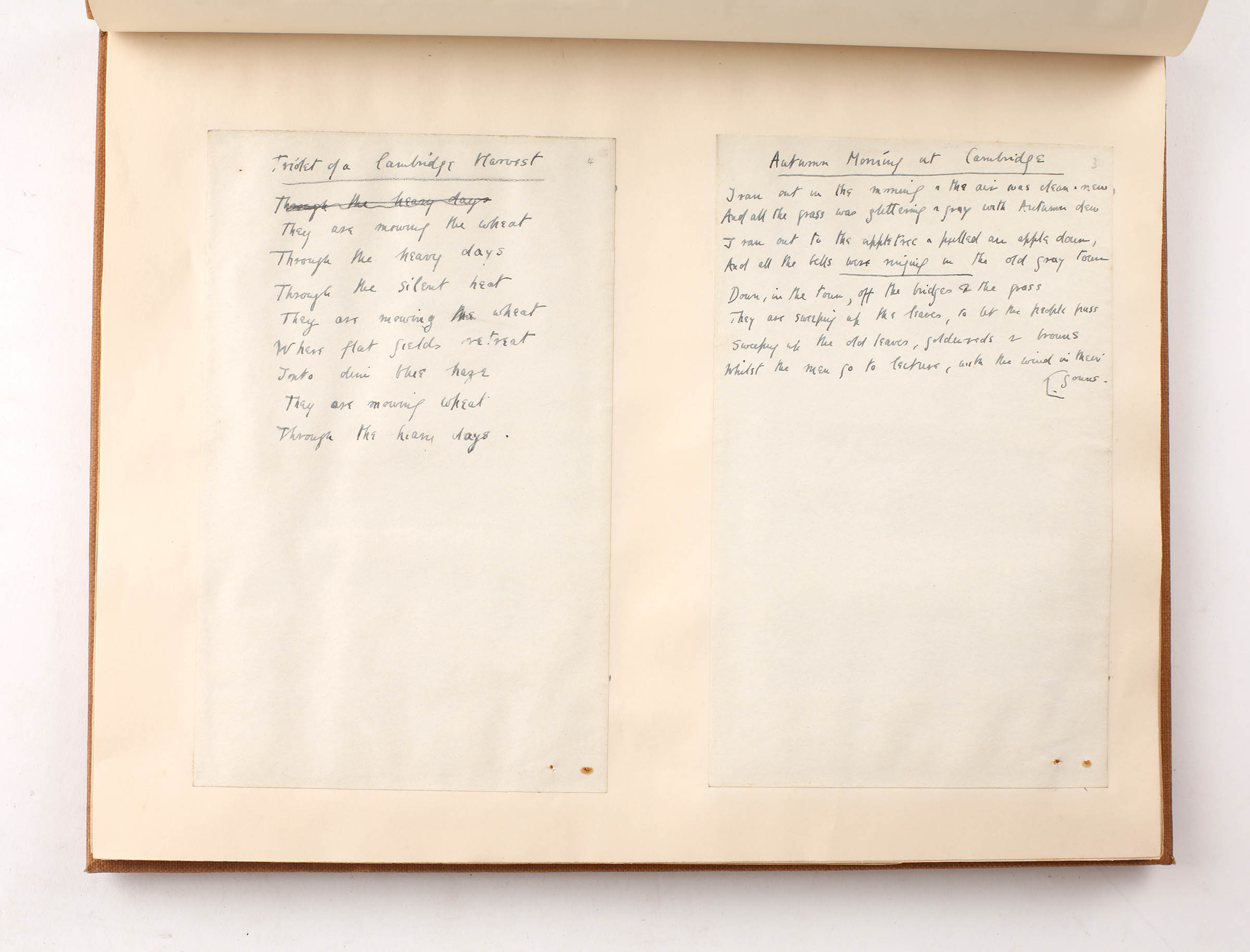 A collection of 74 manuscript poems on 77 sheets, which includes different versions of the same poems in several cases. They include 29 of the 31 poems in Cornford's first collection, Poems (1910), many in multiple states of development, as well as 21 uncollected poems, all apparently unpublished except "The Dance of Death", which appeared in Country Life. Written in pencil or ink, variously dated 1902-09 or undated and on various sheet sizes and paper stocks: mounted on stubs or in pairs onto larger sheets. The whole bound in brown buckram with a morocco title label by Maltby of Oxford and housed in a later quarter morocco clamshell box. With six autograph letters and three autograph cards from Cornford to Seigfried Sassoon. Generally in very good condition with two sheets with repaired tears.