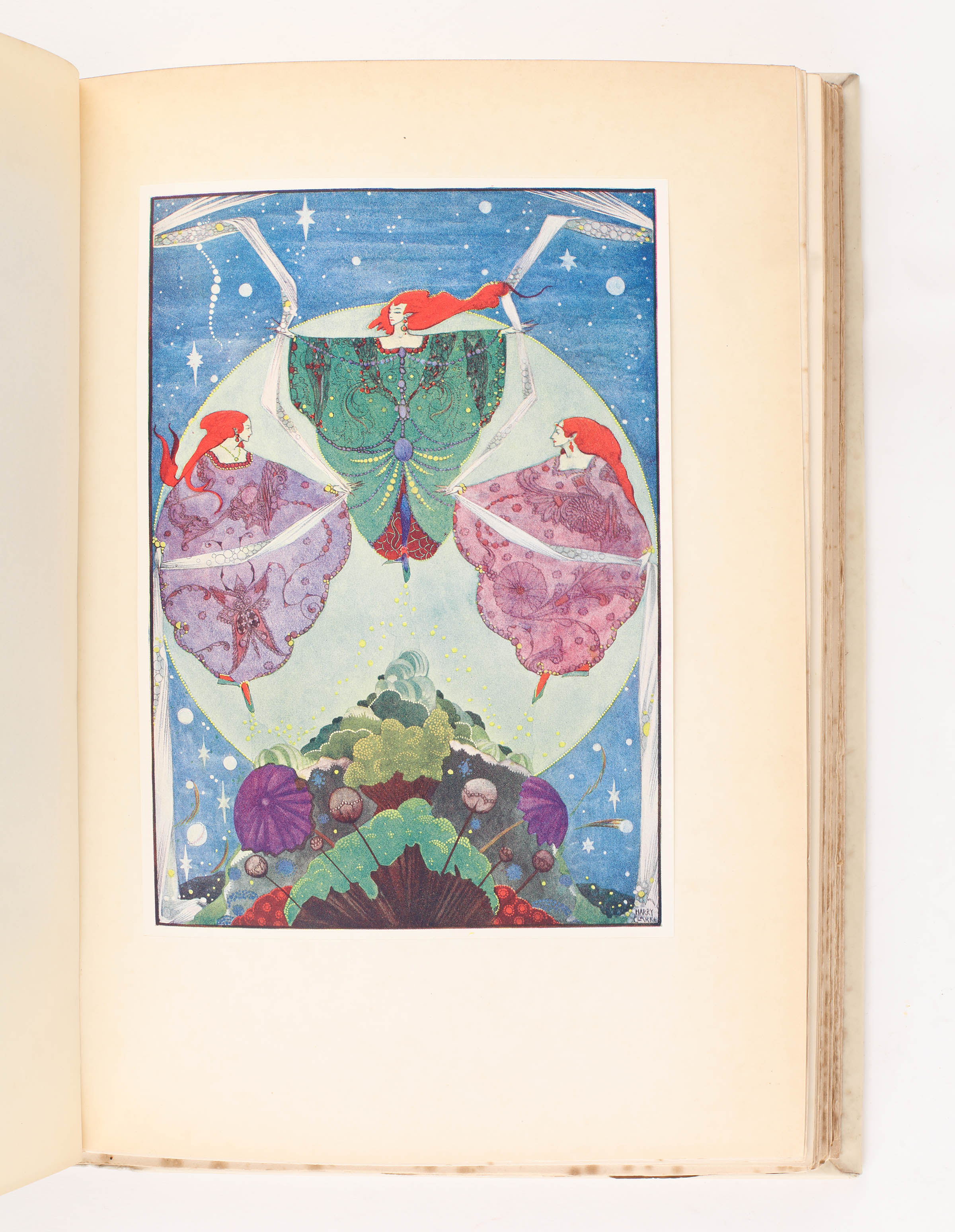 Clarke's first Gift Book and one of the rarest and most sought after books of this Golden Age period. "A new Irish artist" announced Harrap's large advertisement in the 1919 Bookman, "whose work will certainly command extreme admiration. Mr Clarke brings to Hans Andersen an entirely fresh interpretation and he appeals to the intellectual emotions of art lovers." Contemporary reviews made comment on the influence of Beardsley upon Clarke's illustration and it is true that the black and whites drawings are very reminiscent of the intricacy of Beardsley's work. Clarke, however, has a very distinctive style of his own which is most marked in his colour illustrations, some of which have a delicate colour palette and a distinctly Art Nouveau feel, while others use the deep, bold colours seen in the artist's stained glass designs.