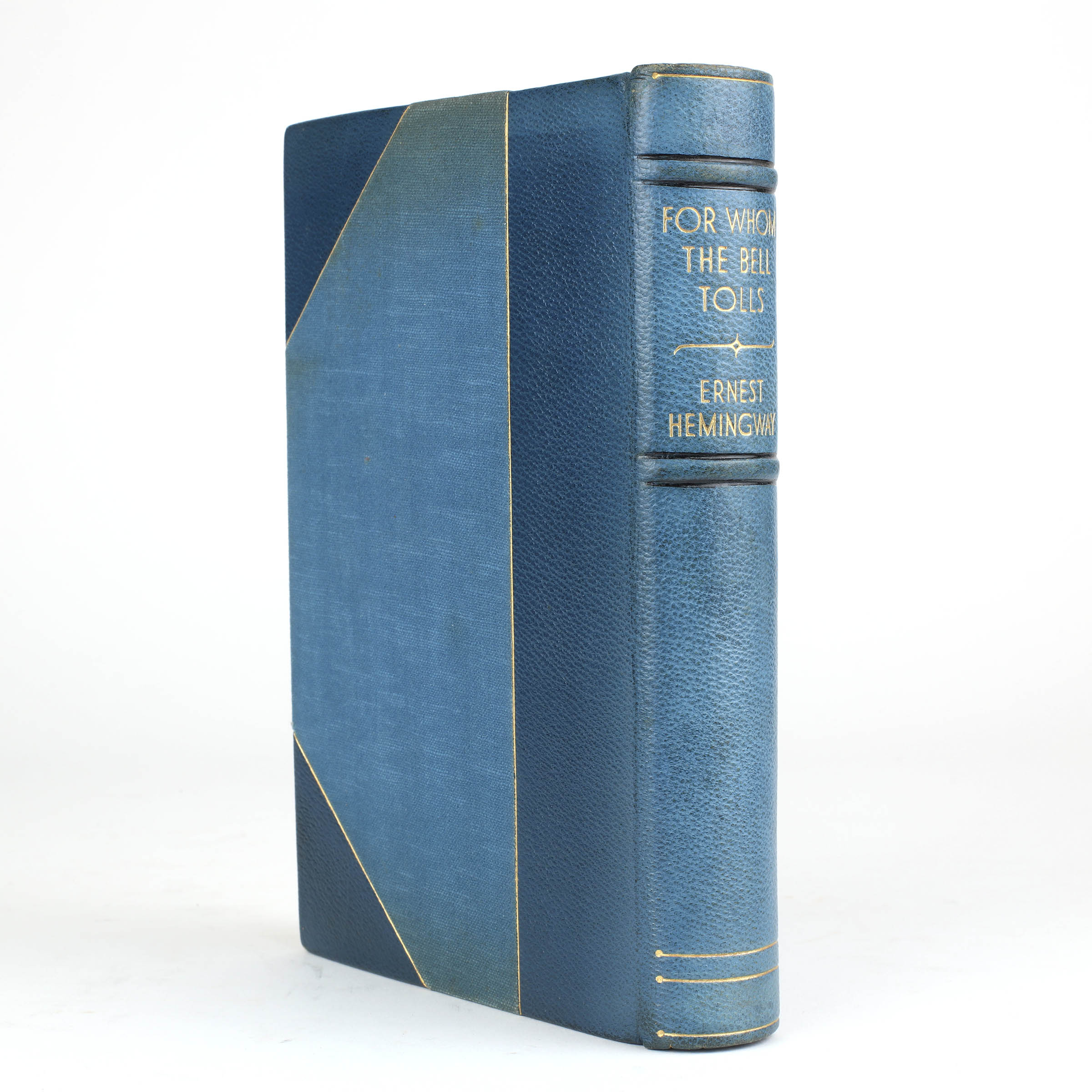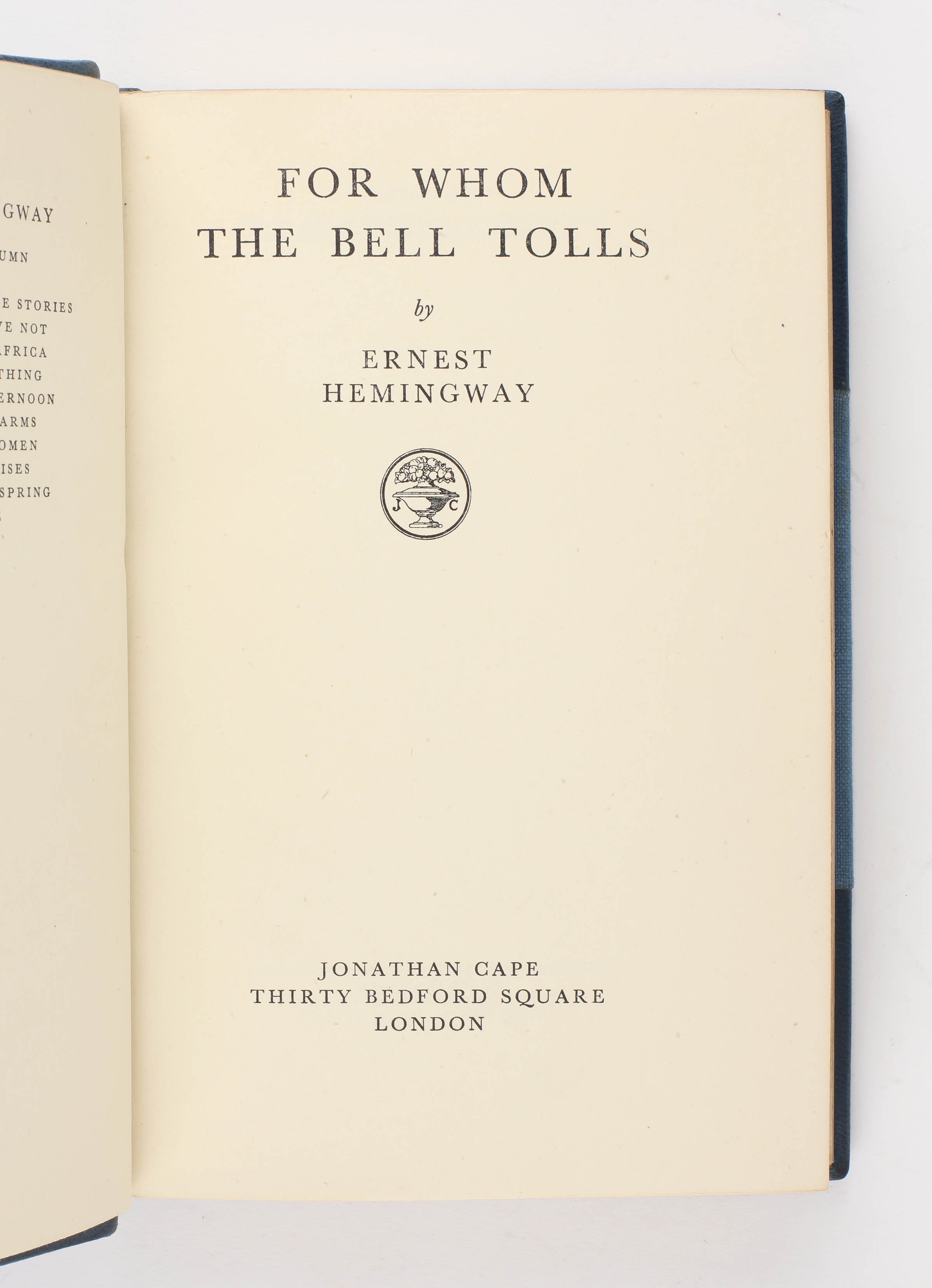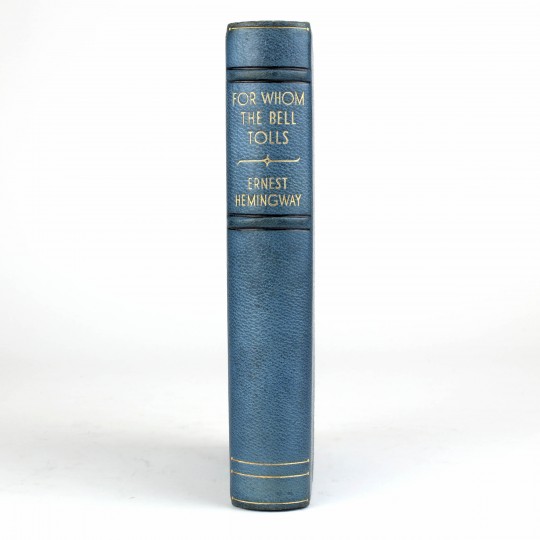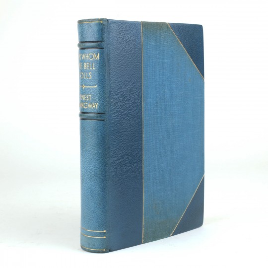 The binding of the copy is unrecorded by either of Hemingway's bibliographers, but is almost certainly publisher commissioned as it is stamped A.W.Bain & Co., who was the same trade binder that Cape used for the binding up of the standard copies of the first UK edition and uses the the same lettering and device on the spine. It is probably one of a small number produced for presentation or distribution among key Cape staff.