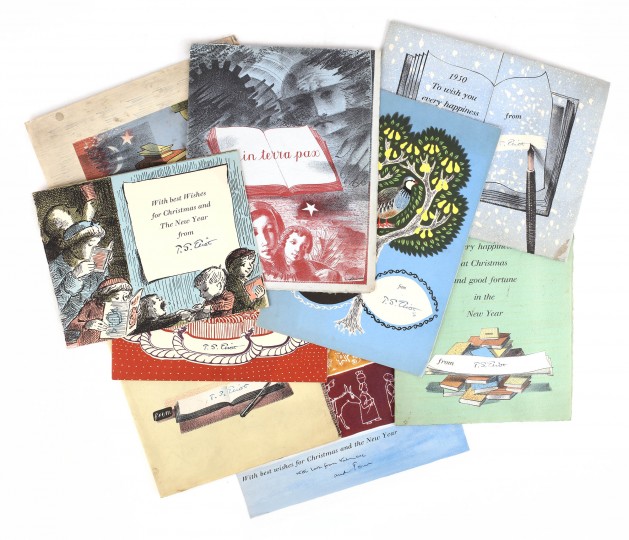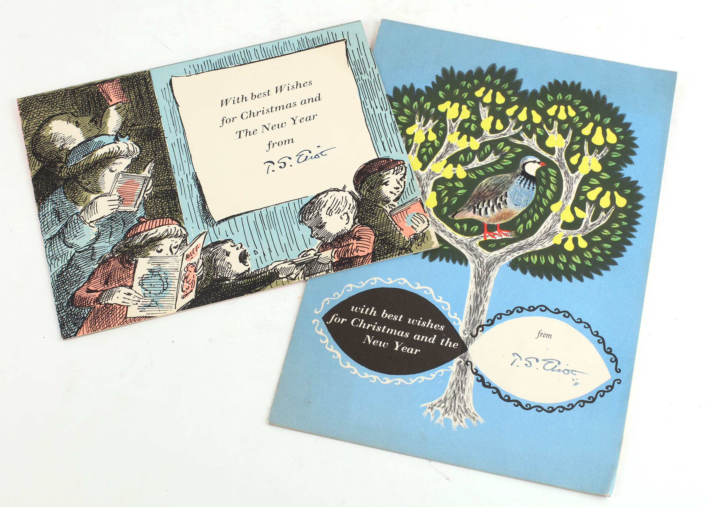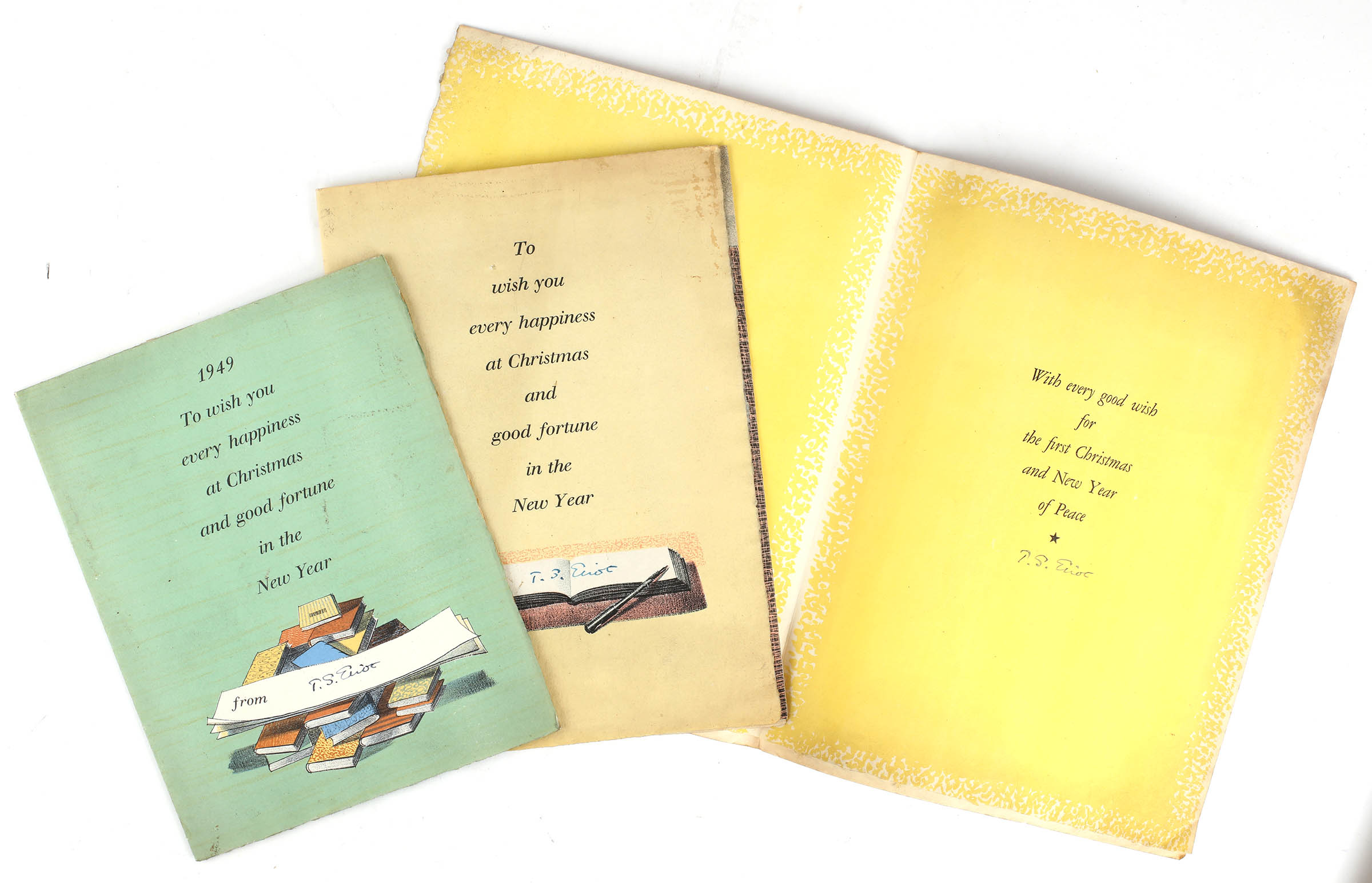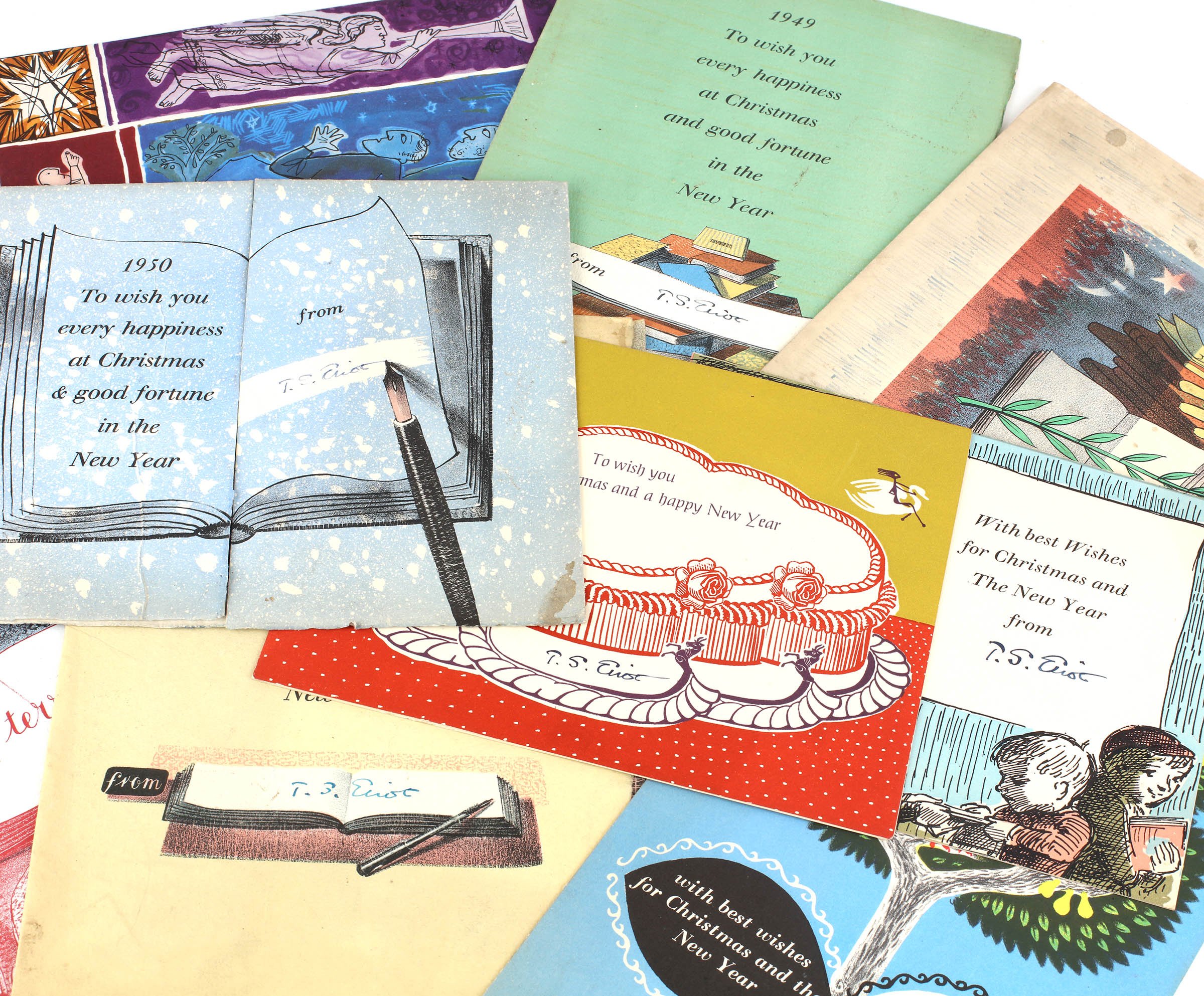 Nine official Faber Christmas cards, each signed by T.S.Eliot and given by him to his friends, Michael and Janet Richards. Each card designed and illustrated in lithograph by a Faber illustrator, including Barnett Freedman, Edward Bawden, Edward Ardizzone, Alan Howard and Gerald Rose. Generally in very good condition indeed with occasional dustiness to the covers and odd marks.