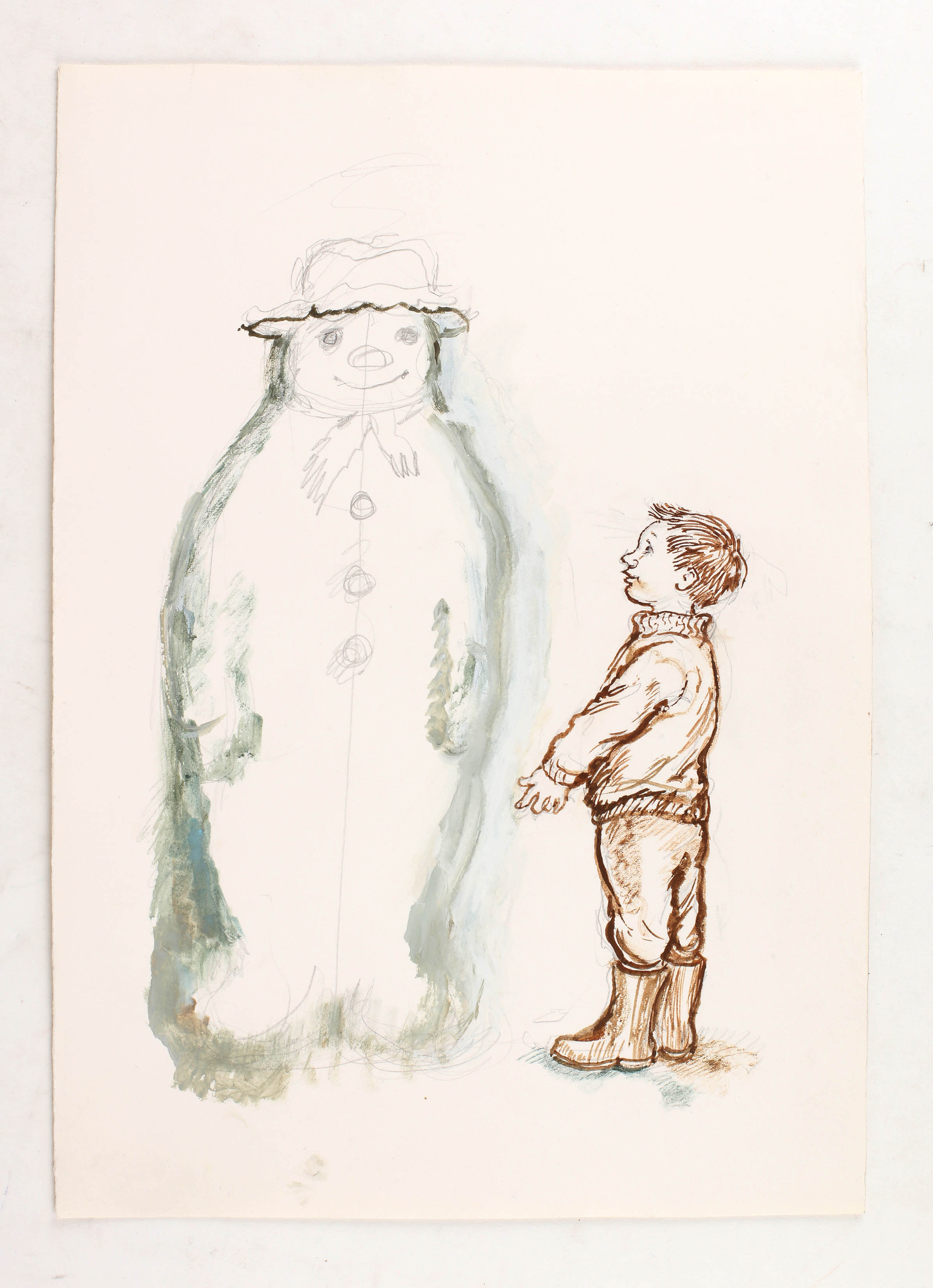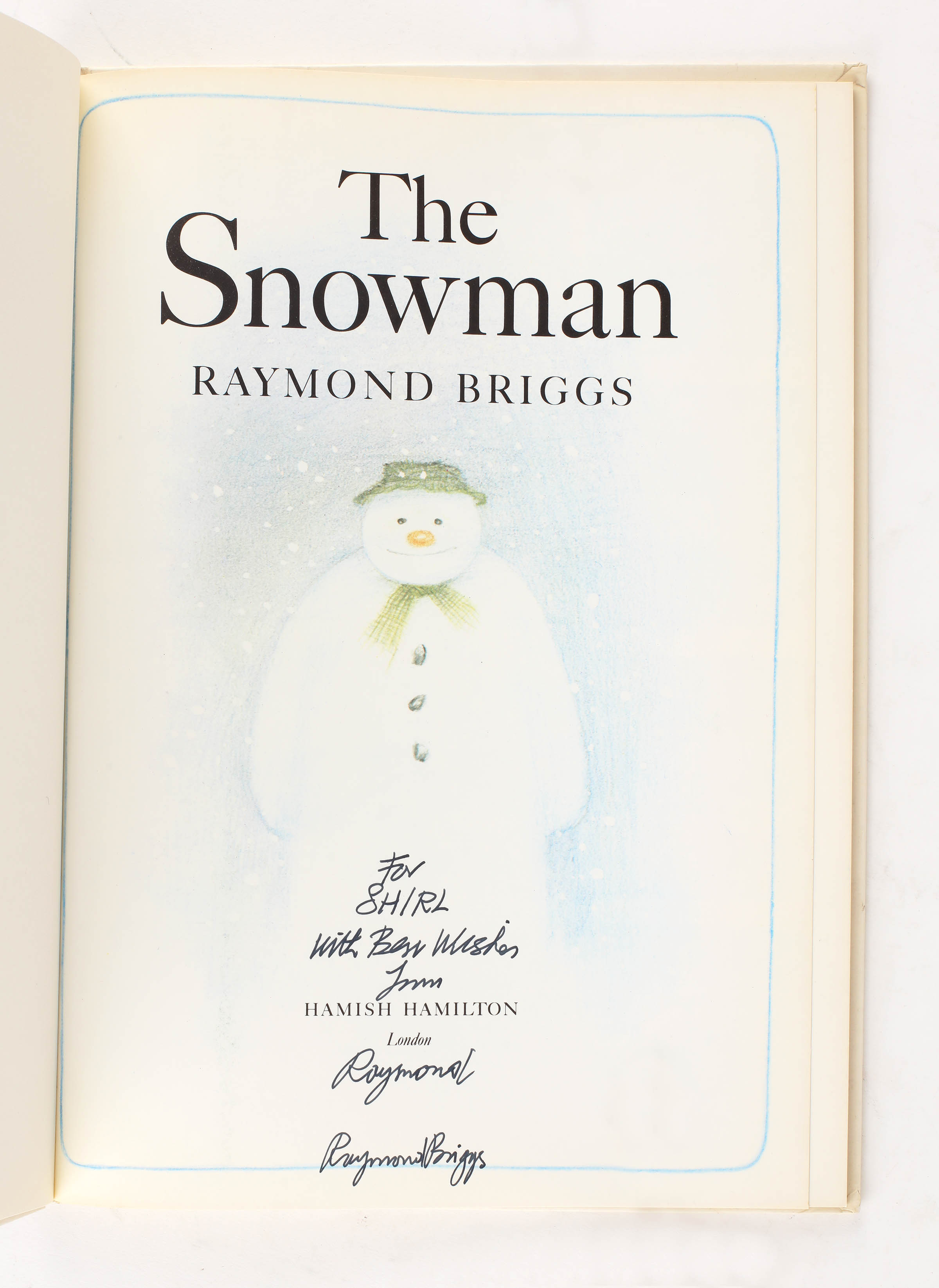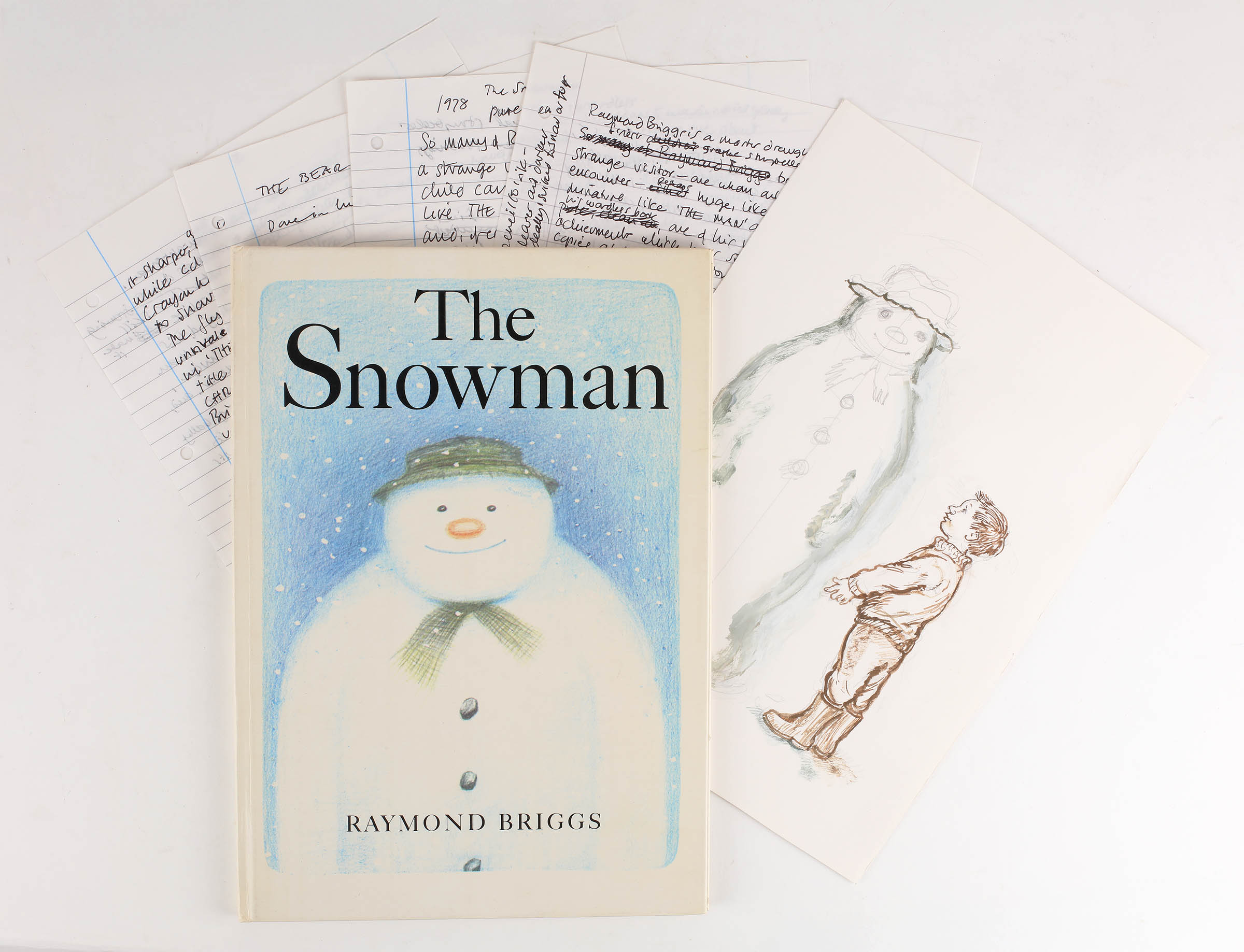 First edition. 4to. Original laminated pictorial boards. Author's presentation copy, inscribed on the title page to fellow children's author and illustrator Shirley Hughes, "For SHIRL With Best Wishes from Raymond / Raymond Briggs".Together with a preliminary sketch by Hughes in pencil and watercolour and four leaves of autograph manuscript by Shirley Hughes. The story of the Snowman is told entirely with colour illustrations by Briggs without any text. The sketch by Hughes in pencil and watercolour, of the Snowman and a little boy (though looking very much like Alfie) in preparation for a watercolour Hughes created for an exhibition of 2018. A fine copy, with just the slightest bumping to spine ends. The drawing and manuscript in excellent condition.
